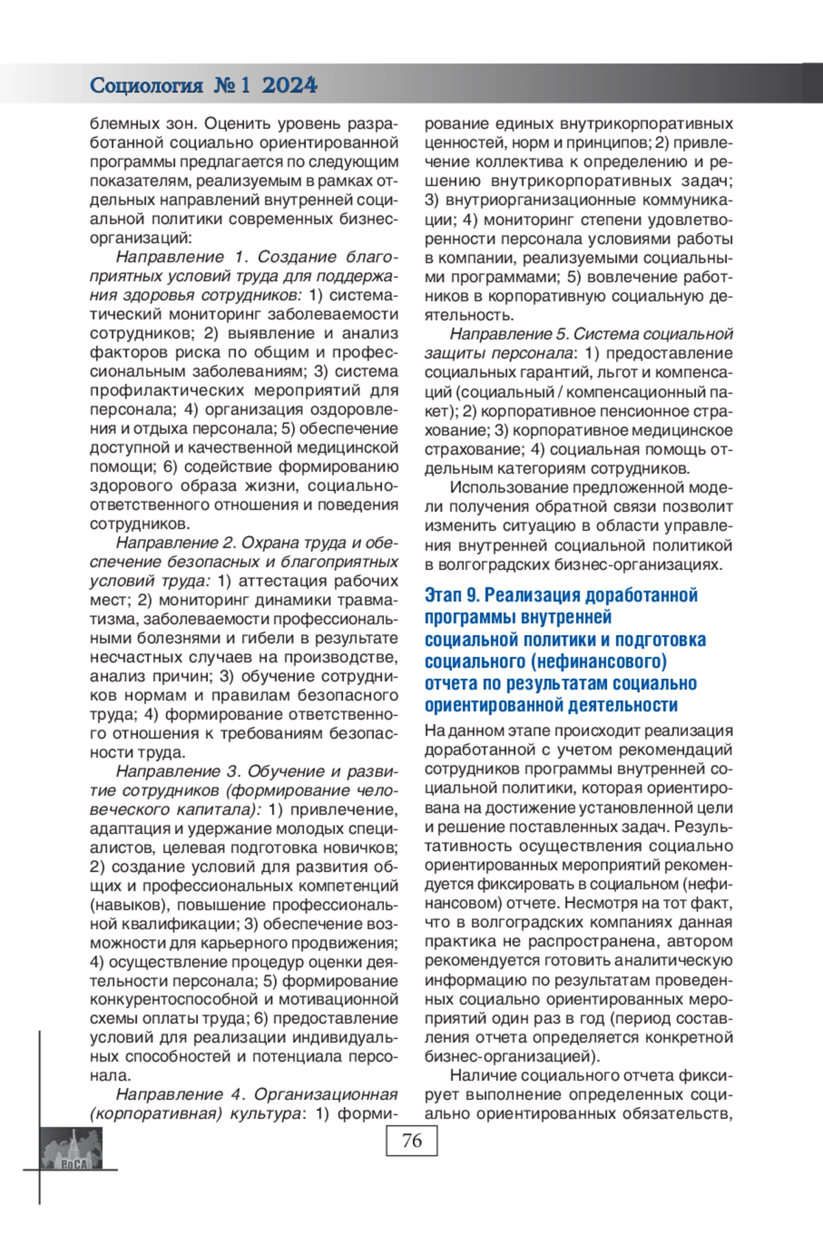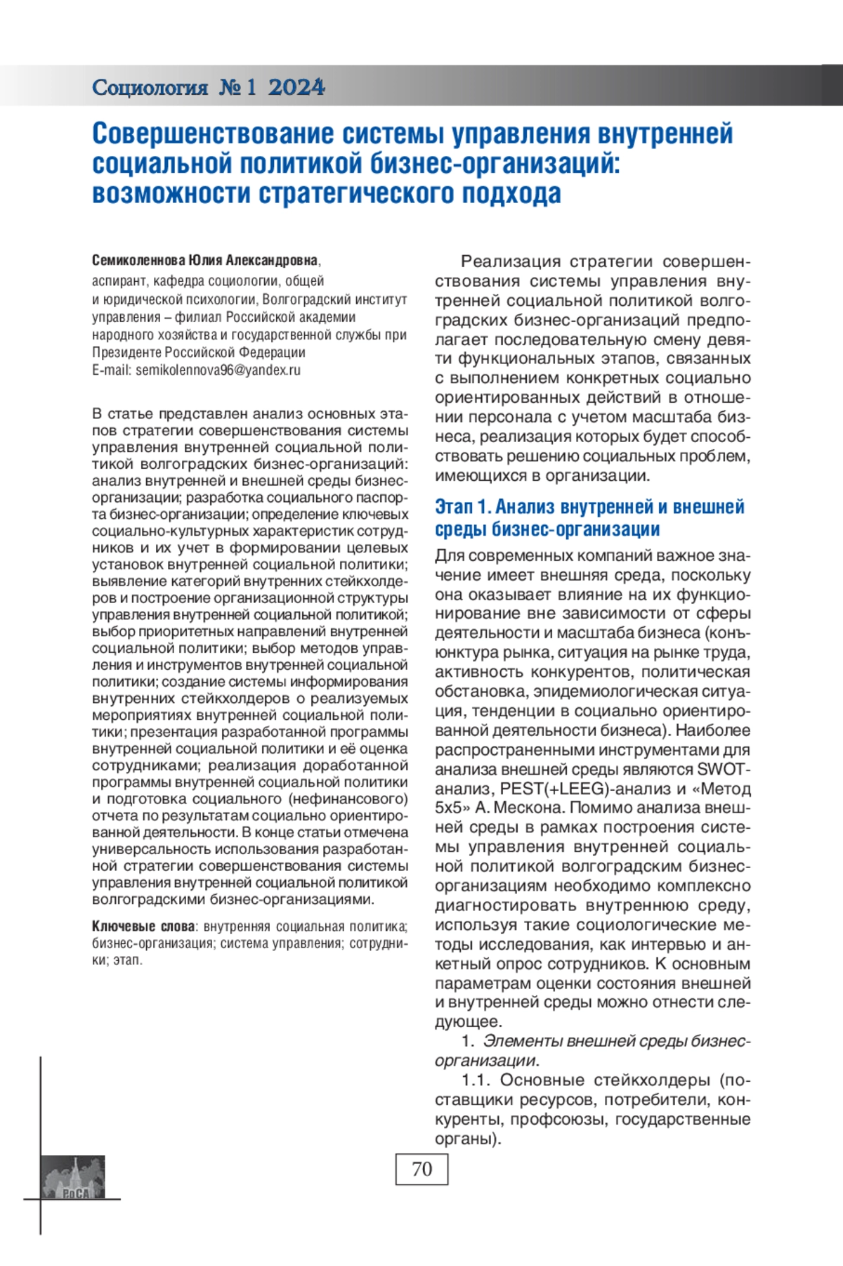 В статье представлен анализ основных этапов стратегии совершенствования системы управления внутренней социальной политикой волгоградских бизнес-организаций: анализ внутренней и внешней среды бизнесорганизации; разработка социального паспорта бизнес-организации; определение ключевых социально-культурных характеристик сотрудников и их учет в формировании целевых установок внутренней социальной политики; выявление категорий внутренних стейкхолдеров и построение организационной структуры управления внутренней социальной политикой; выбор приоритетных направлений внутренней социальной политики; выбор методов управления и инструментов внутренней социальной политики; создание системы информирования внутренних стейкхолдеров о реализуемых мероприятиях внутренней социальной политики; презентация разработанной программы внутренней социальной политики и её оценка сотрудниками; реализация доработанной программы внутренней социальной политики и подготовка социального (нефинансового) отчета по результатам социально ориентированной деятельности. В конце статьи отмечена универсальность использования разработанной стратегии совершенствования системы управления внутренней социальной политикой волгоградскими бизнес-организациями.
