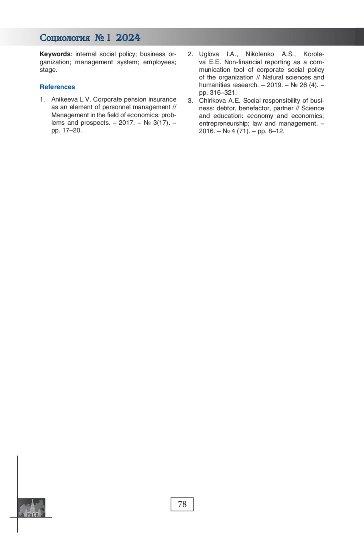 1. Аникеева Л.В. Корпоративное пенсионное страхование как элемент управления персоналом // Управление в сфере экономики: проблемы и перспективы. - 2017. - № 3(17). - С. 17-20.
