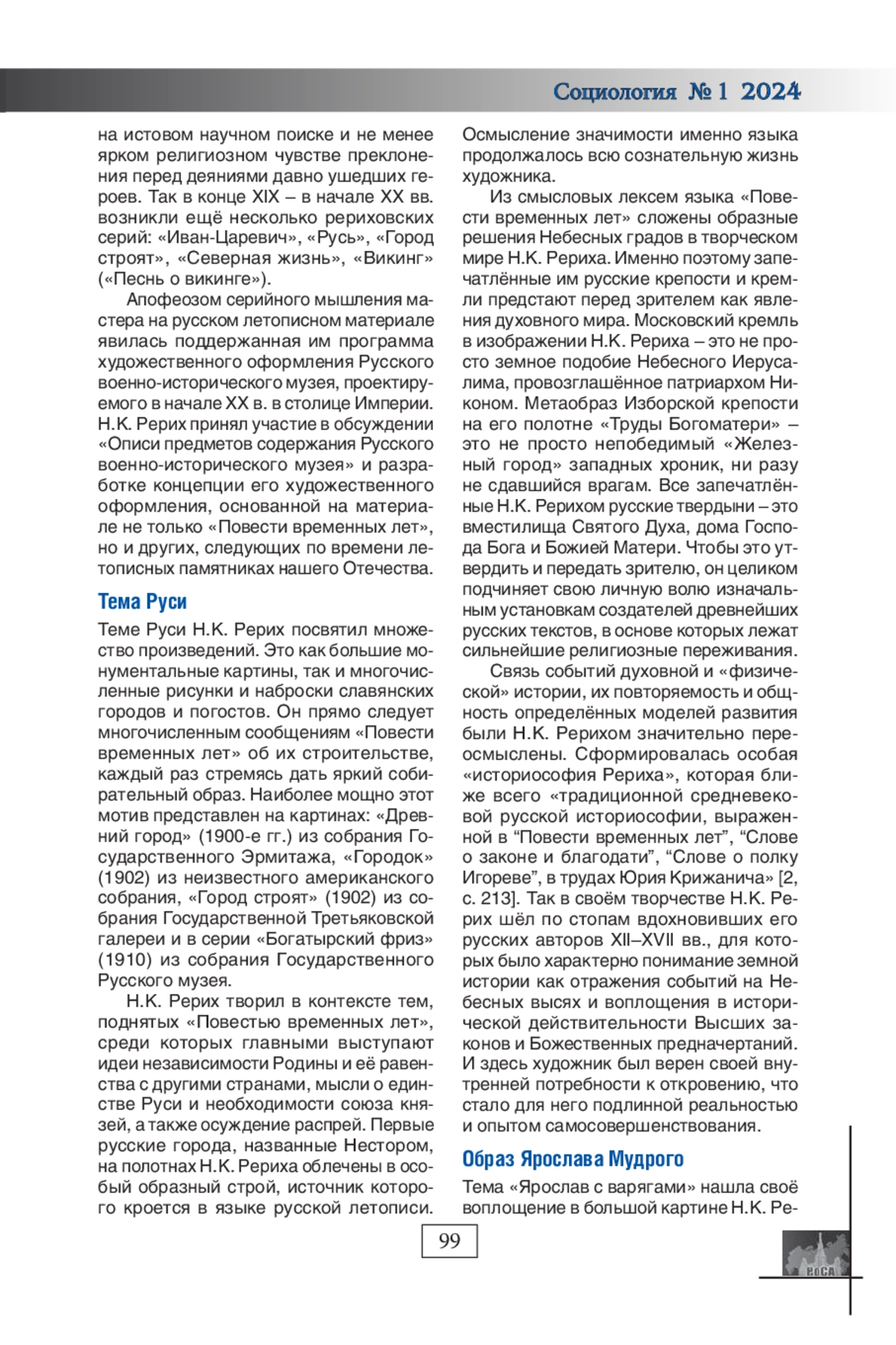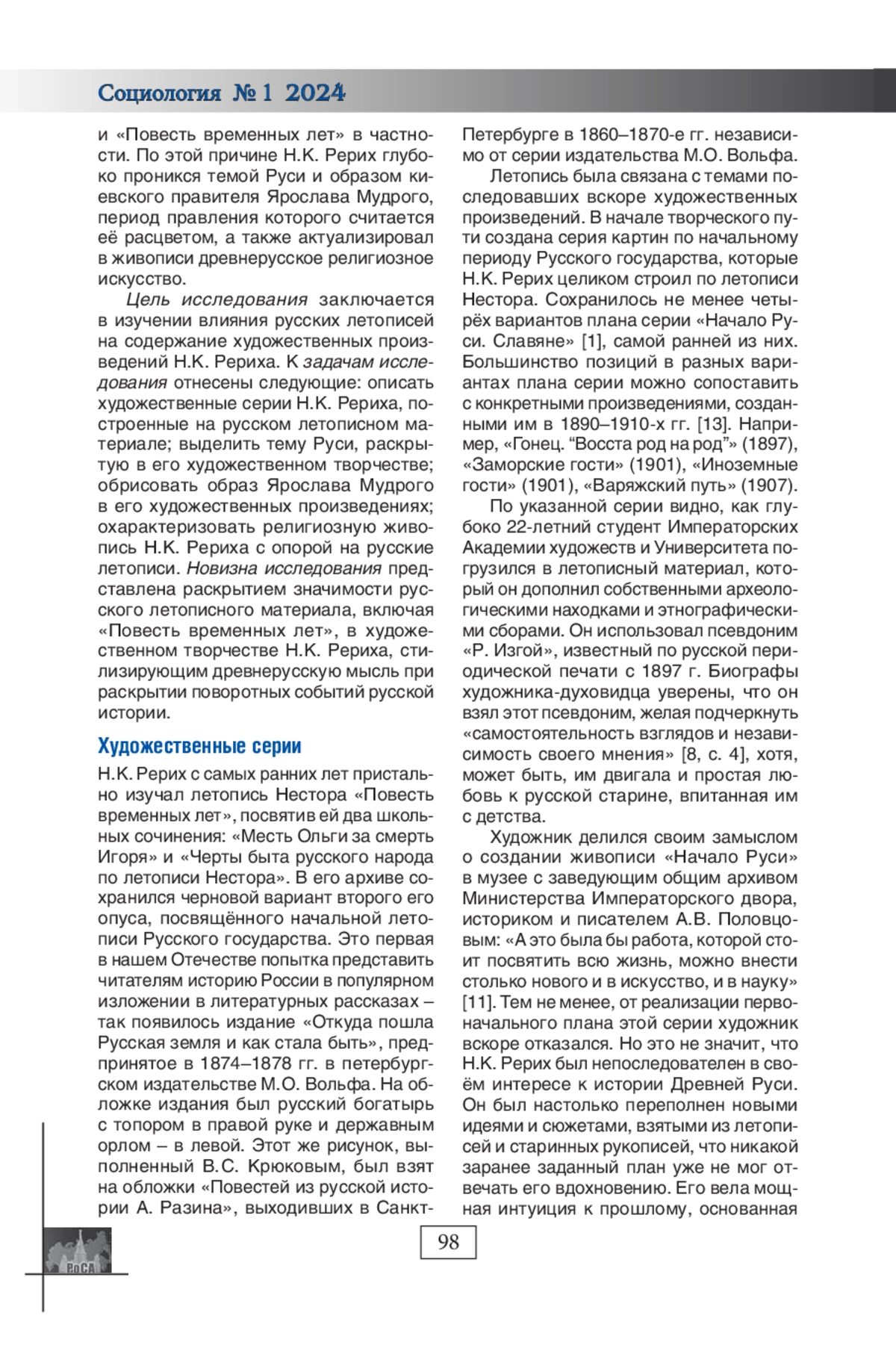 Русские летописи определили развитие русской культуры, послужив источником вдохновения для разных деятелей искусства. Статья посвящена изучению влияния русских летописей на содержание художественных произведений Н. К. Рериха. Описаны его художественные серии, включая «Начало Руси. Славяне». Выделена тема Руси, раскрытая в его художественном творчестве; переосмысление событий русской истории послужило основой для формирования историософии Рериха. Обрисован образ Ярослава Мудрого преимущественно на таких полотнах, как «Варяжское море», «Радовашеся Ярослав граду Киеву». С опорой на русские летописи охарактеризована религиозная живопись Н. К. Рериха, расцвет которой пришёлся на 1906-1916 гг. Н. К. Рерих стилизировал в художественных произведениях древнерусскую мысль при раскрытии поворотных событий русской истории.