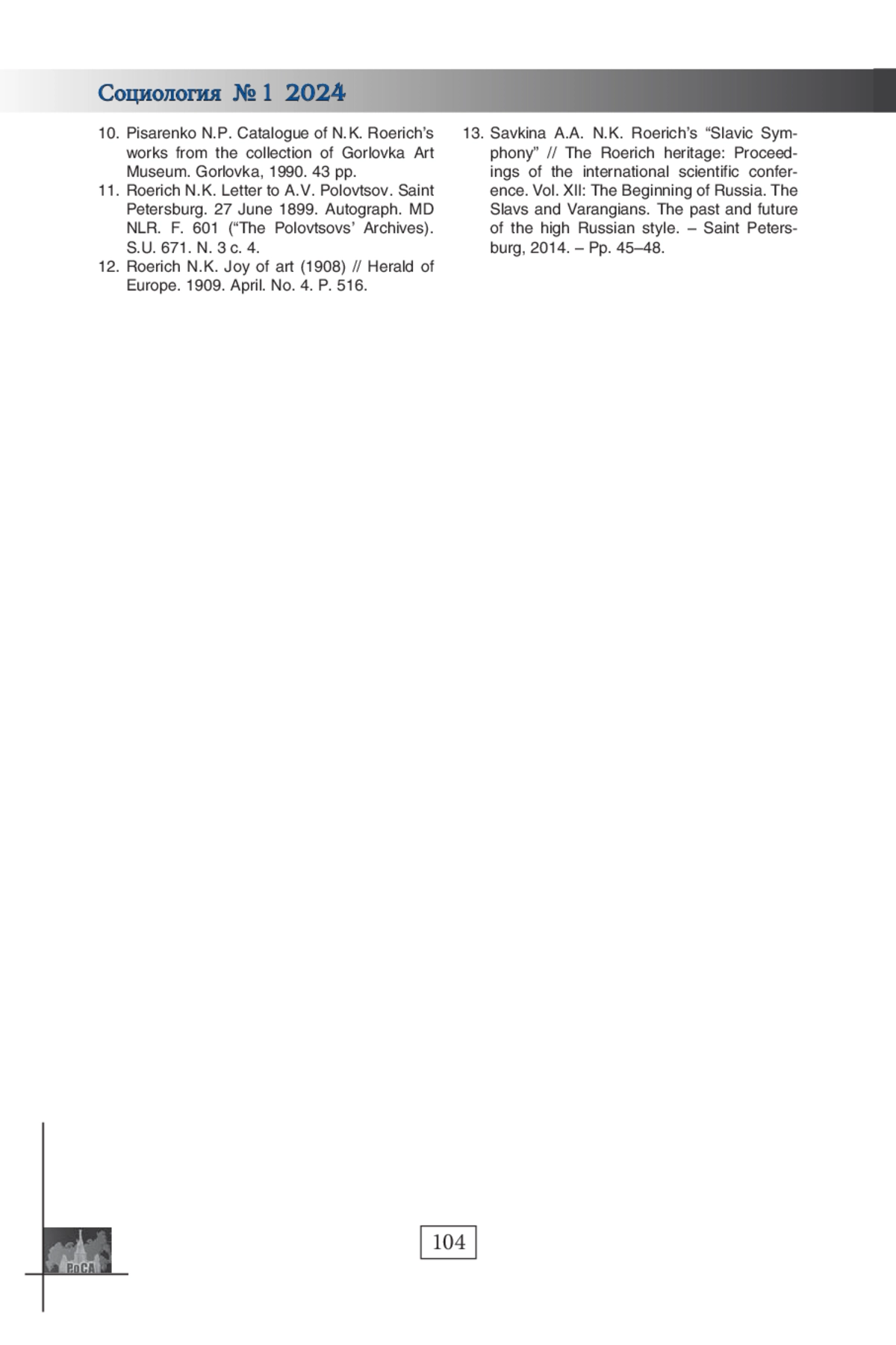 13. Савкина А.А. “Славянская симфония” Н. К. Рериха // Рериховское наследие: Труды Междунар. науч.-практ. конф. Т. XII: Начало Руси. Славяне и варяги. Прошлое и будущее высокого Русского стиля. СПб., 2014. С. 45-48.