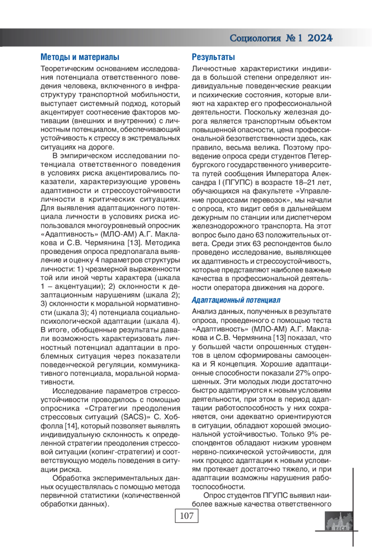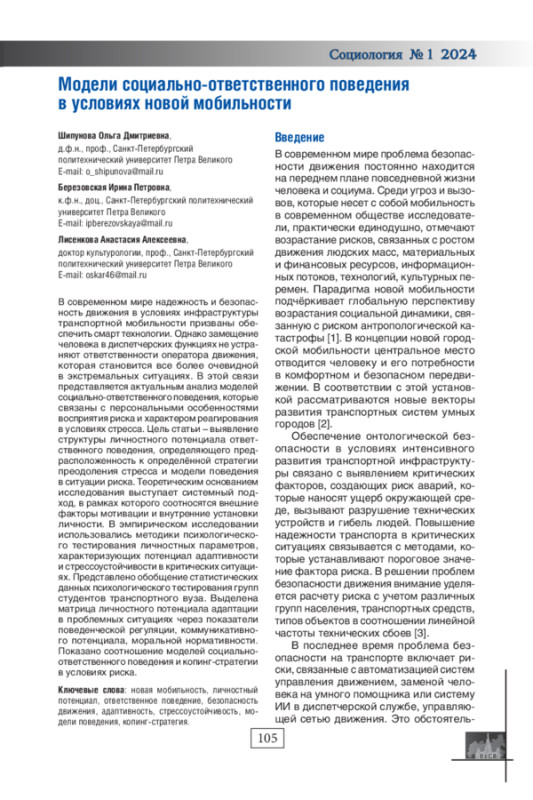 В современном мире надежность и безопасность движения в условиях инфраструктуры транспортной мобильности призваны обеспечить смарт технологии. Однако замещение человека в диспетчерских функциях не устраняют ответственности оператора движения, которая становится все более очевидной в экстремальных ситуациях. В этой связи представляется актуальным анализ моделей социально-ответственного поведения, которые связаны с персональными особенностями восприятия риска и характером реагирования в условиях стресса. Цель статьи - выявление структуры личностного потенциала ответственного поведения, определяющего предрасположенность к определённой стратегии преодоления стресса и модели поведения в ситуации риска. Теоретическим основанием исследования выступает системный подход, в рамках которого соотносятся внешние факторы мотивации и внутренние установки личности. В эмпирическом исследовании использовались методики психологического тестирования личностных параметров, характеризующих потенциал адаптивности и стрессоустойчивости в критических ситуациях. Представлено обобщение статистических данных психологического тестирования групп студентов транспортного вуза. Выделена матрица личностного потенциала адаптации в проблемных ситуациях через показатели поведенческой регуляции, коммуникативного потенциала, моральной нормативности. Показано соотношение моделей социальноответственного поведения и копинг-стратегии в условиях риска.