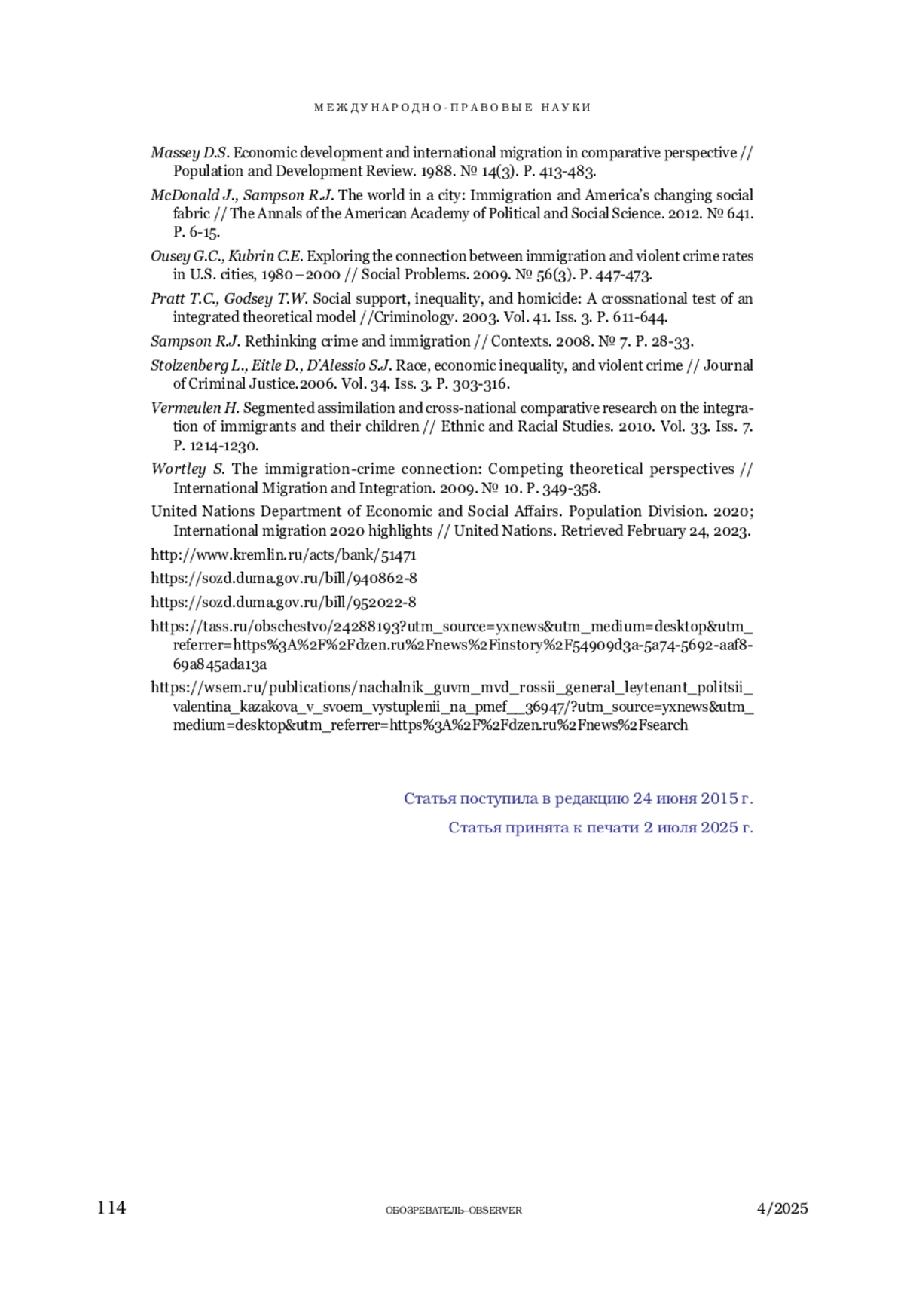 25. Ousey G.C., Kubrin C.E. Exploring the connection between immigration and violent crime rates in U.S. cities, 1980-2000 // Social Problems. 2009. № 56(3). Р. 447-473.
