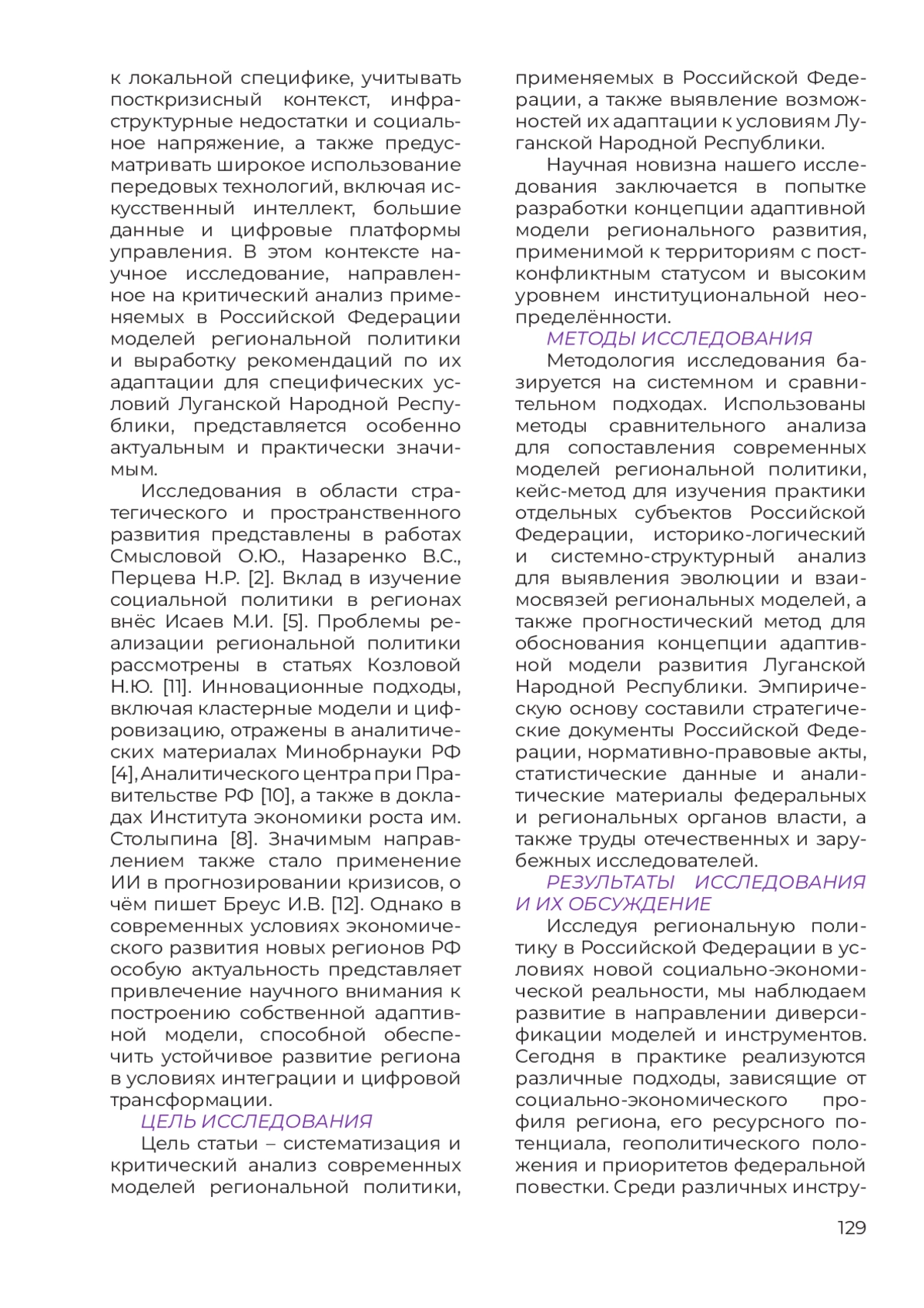 В статье рассмотрены современные модели региональной политики, применяемые в условиях новой социально-экономической реальности на примерах регионов Российской Федерации. Проведён сравнительный анализ стратегического, инновационно-кластерного, устойчивого, социально-ориентированного, инвестиционно-промышленного, цифрового и других подходов к региональному развитию. Особое внимание уделено возможности адаптации указанных моделей в специфических условиях Луганской Народной Республики с акцентом на необходимость создания собственной адаптивной модели, сочетающей в себе элементы интеграционного восстановления, цифровой трансформации и технологической модернизации. Подчёркивается значение внедрения искусственного интеллекта и цифровых решений для повышения эффективности регионального управления.