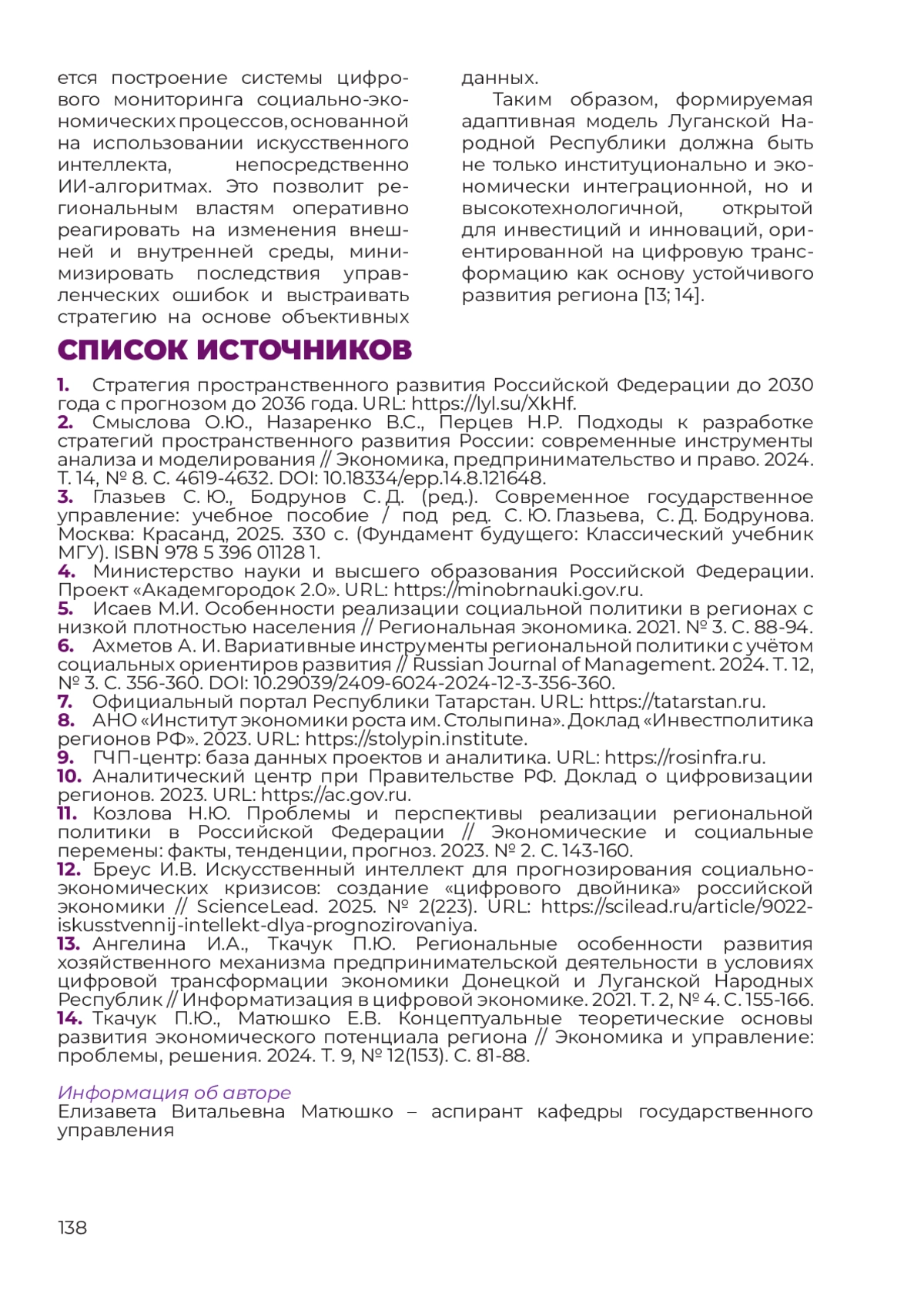 14. Ткачук П.Ю., Матюшко Е.В. Концептуальные теоретические основы развития экономического потенциала региона // Экономика и управление: проблемы, решения. 2024. Т. 9, № 12(153). С. 81-88.