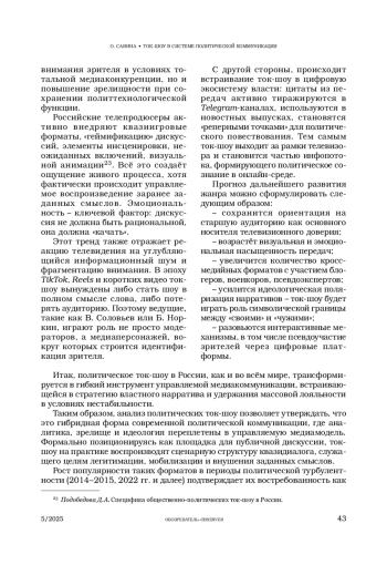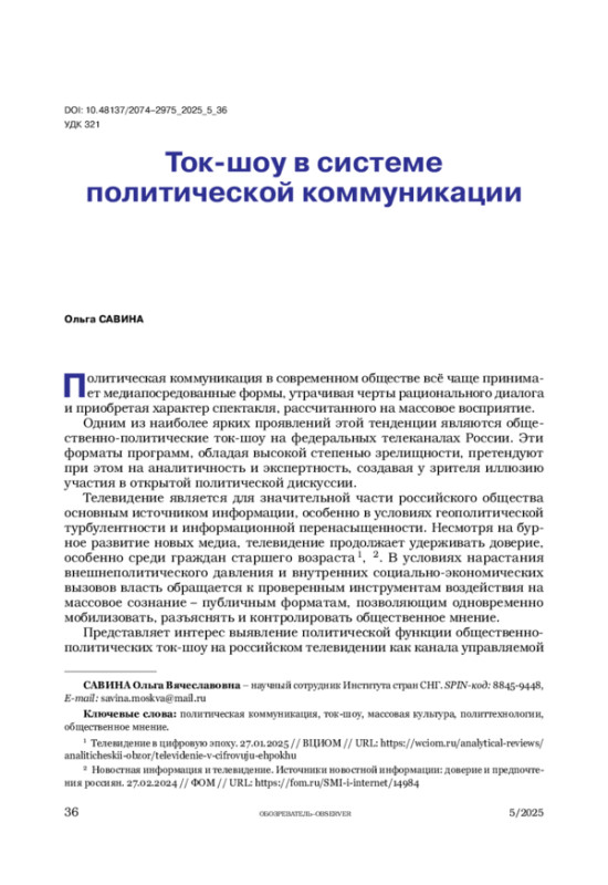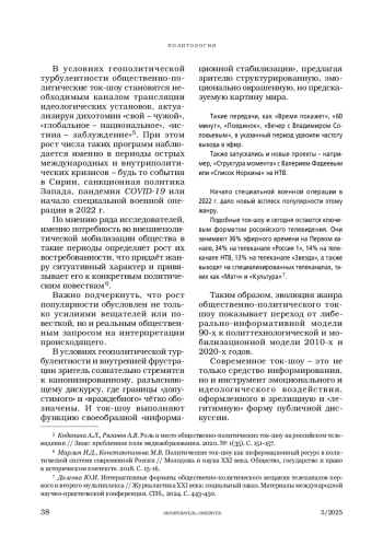 5. Коданина А.Л., Рязанов А.В. Роль и место общественно-политических ток-шоу на российском телевидении // Знак: проблемное поле медиаобразования. 2020. № 1(35). С. 151-157.