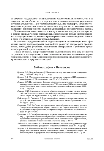 1. Гришин О.Е., Митрофанова А.Д. Политическое шоу как технология коммуникации // PolitBook. 2015. № 3. С. 117-133.