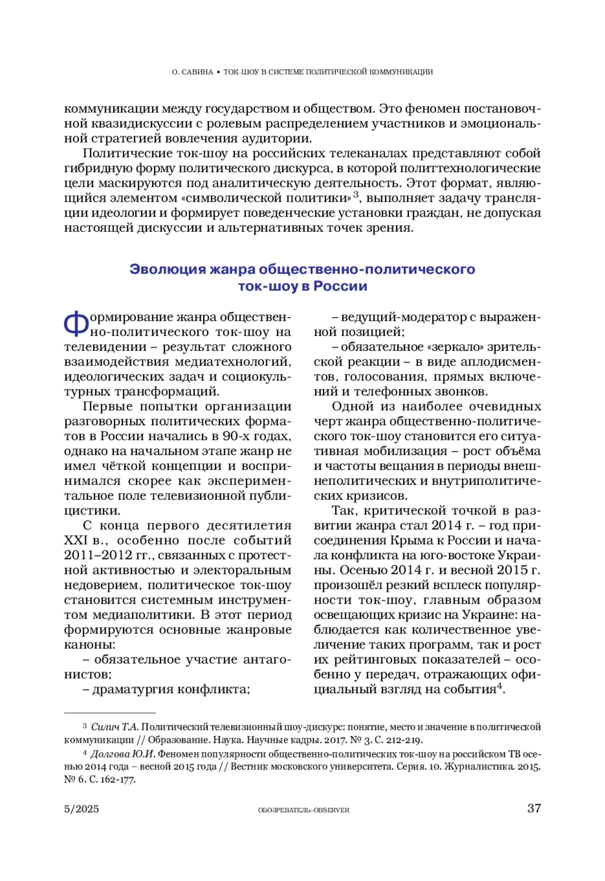 4. Долгова Ю.И. Феномен популярности общественно-политических ток-шоу на российском ТВ осенью 2014 года - весной 2015 года // Вестник московского университета. Серия 10. Журналистика. 2015. № 6. С. 162-177.