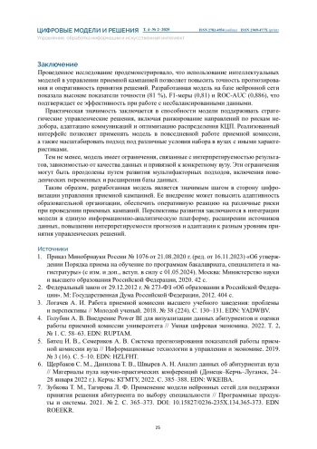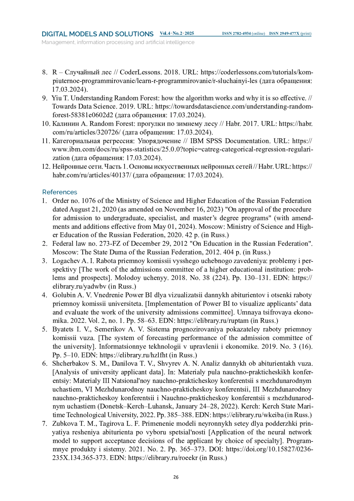 7. Зубкова Т. М., Тагирова Л. Ф. Применение модели нейронных сетей для поддержки принятия решения абитуриента по выбору специальности // Программные продукты и системы. 2021. № 2. С. 365-373. DOI: 10.15827/0236-235X.134.365-373 EDN: ROEEKR