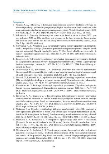 1. Акимов А. А., Тихонов А. И. Цифровая трансформация: основные тенденции и влияние на систему управления персоналом предприятия // Вестник Академии знаний. 2020. № 3 (38). С. 36-43. DOI: 10.24411/2304-6139-2020-10322 EDN: VKUZLO