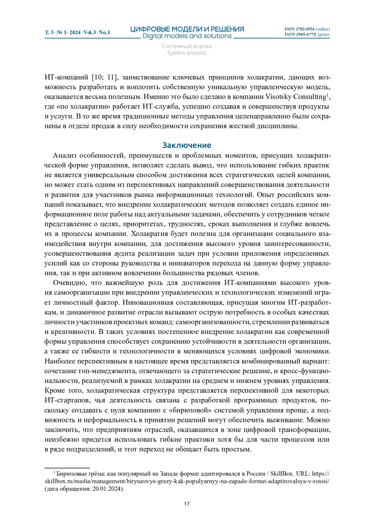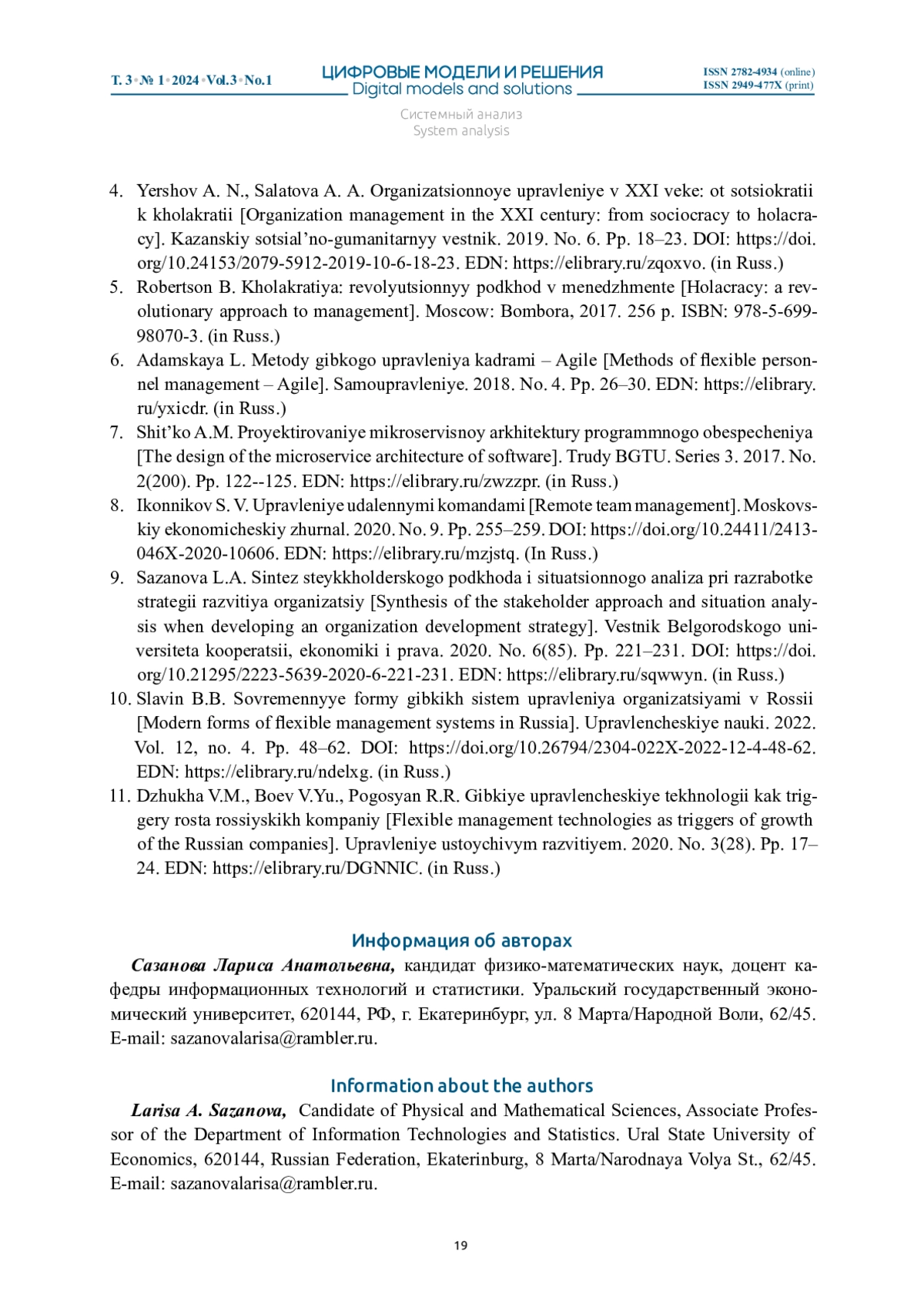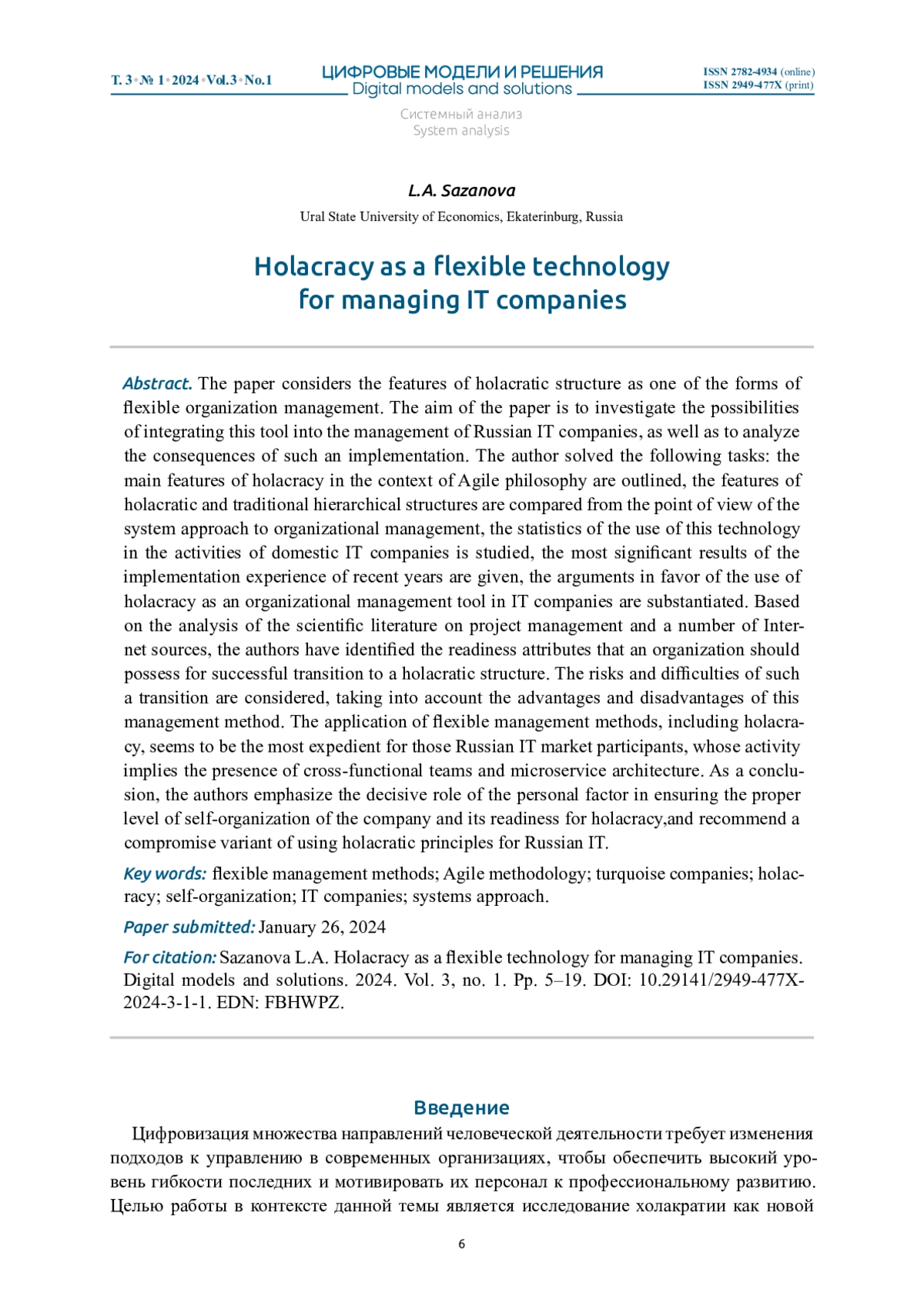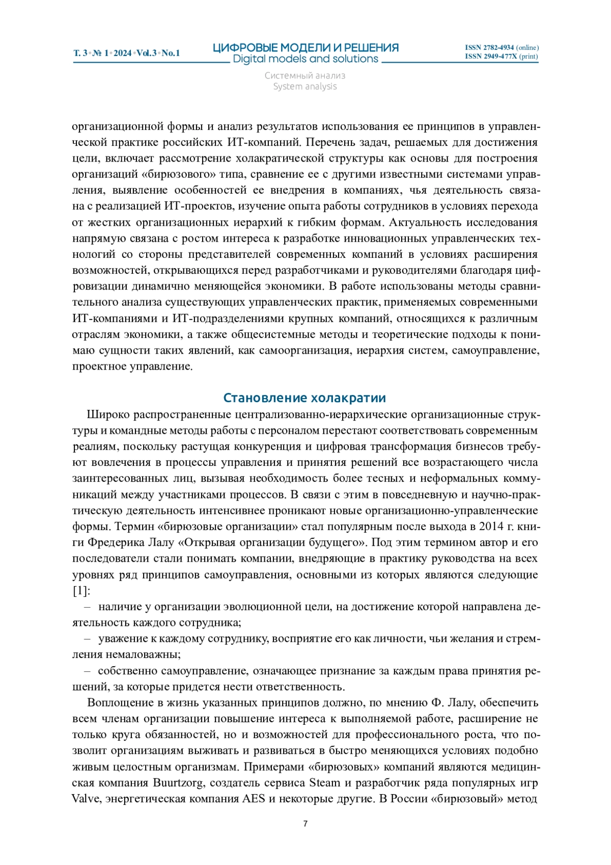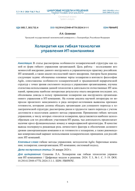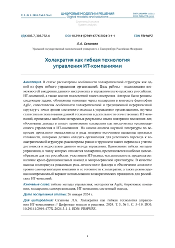 САЗАНОВА Л. А. ХОЛАКРАТИЯ КАК ГИБКАЯ ТЕХНОЛОГИЯ УПРАВЛЕНИЯ ИТ-КОМПАНИЯМИ // ЦИФРОВЫЕ МОДЕЛИ И РЕШЕНИЯ. 2024. Т. 3 № 1