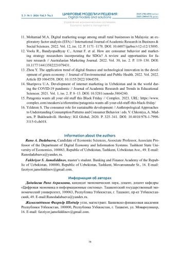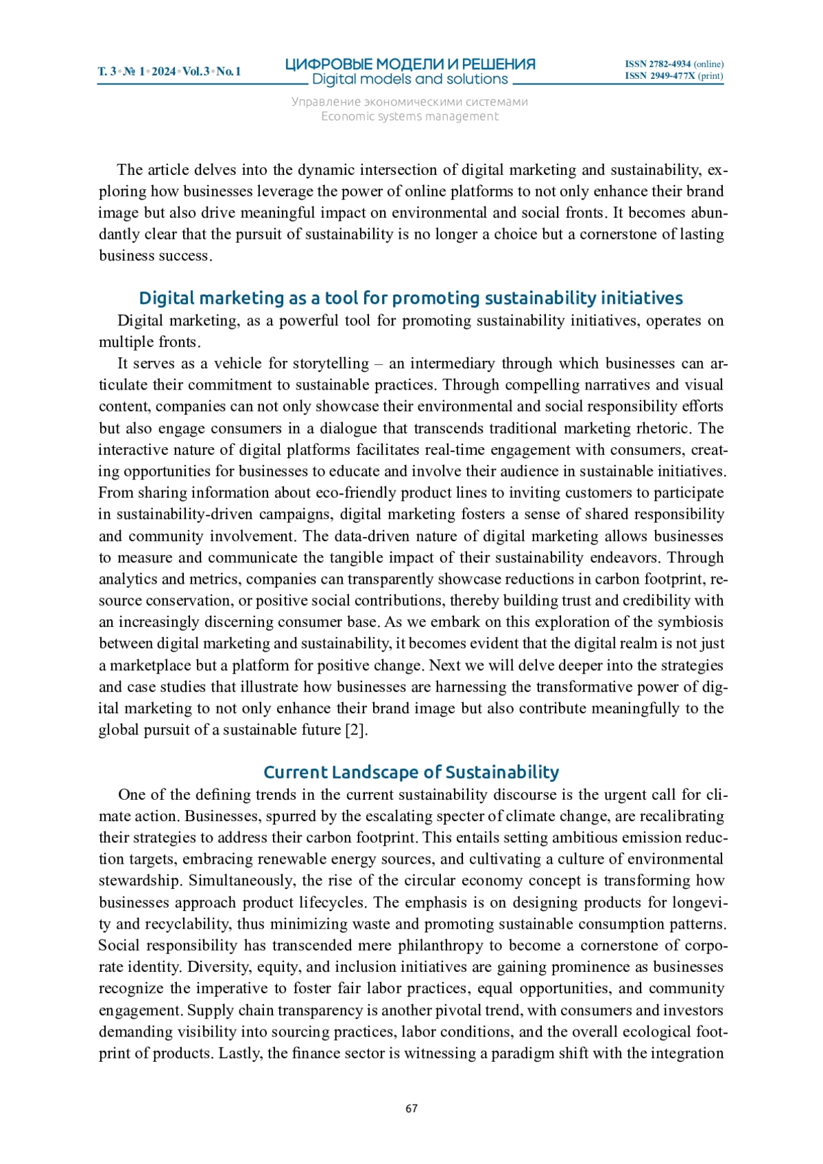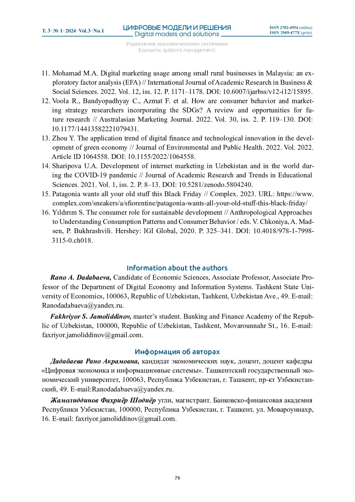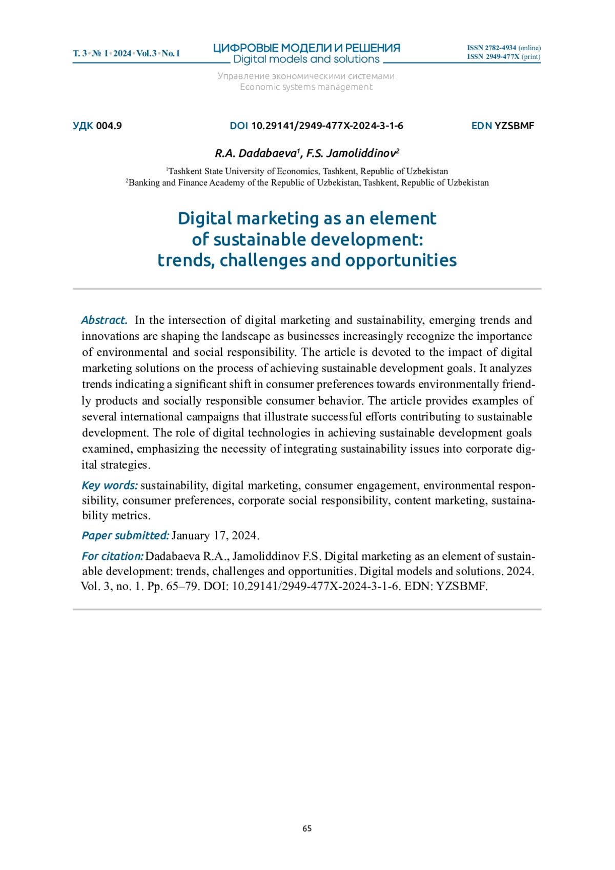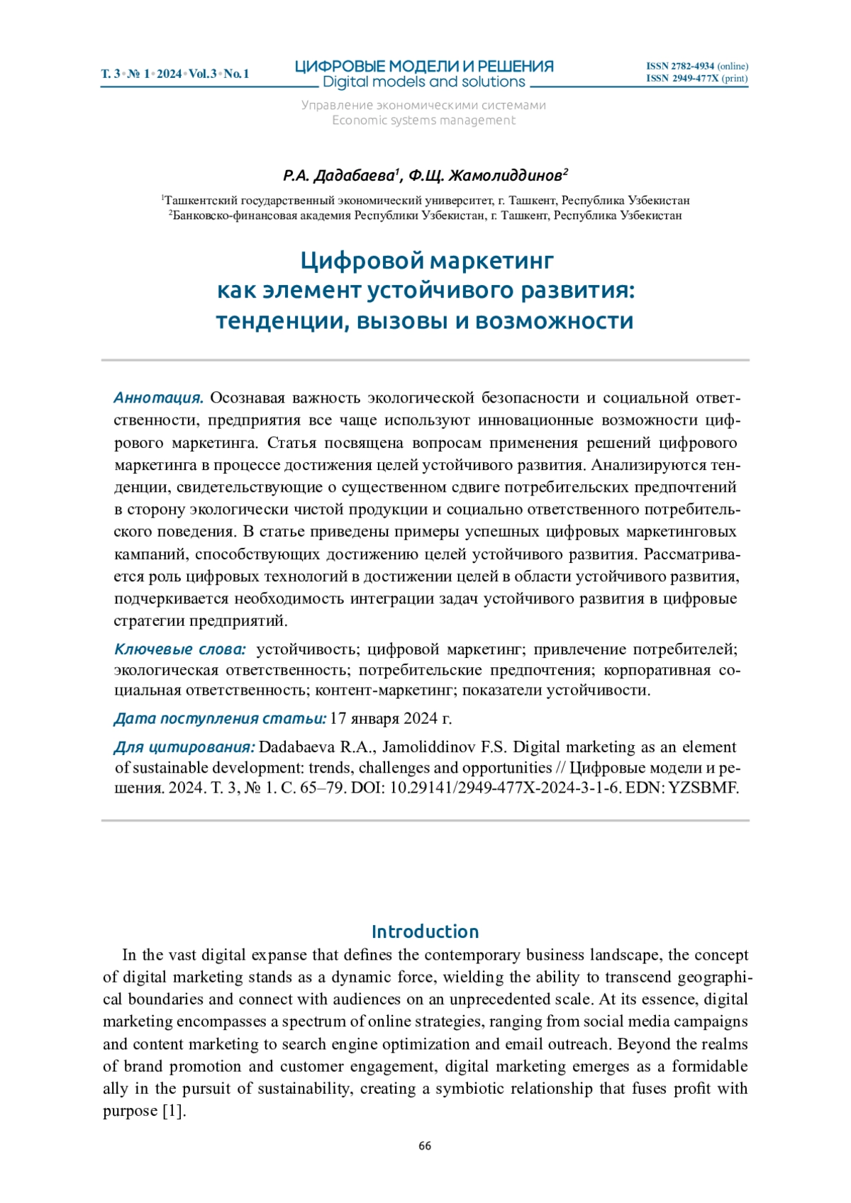 ДАДАБАЕВА Р. А., ЖАМОЛИДДИНОВ Ф. Ш. DIGITAL MARKETING AS AN ELEMENT OF SUSTAINABLE DEVELOPMENT: TRENDS, CHALLENGES AND OPPORTUNITIES // ЦИФРОВЫЕ МОДЕЛИ И РЕШЕНИЯ. 2024. Т. 3 № 1