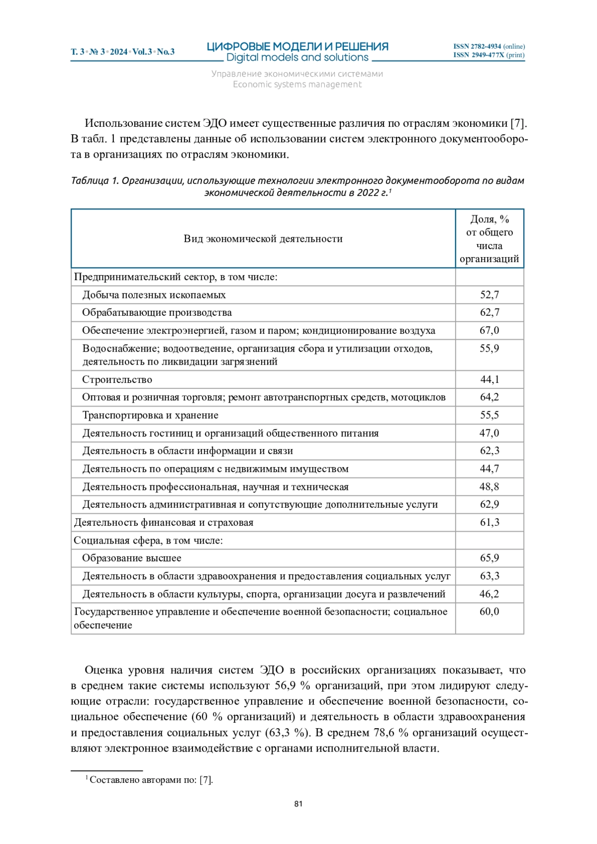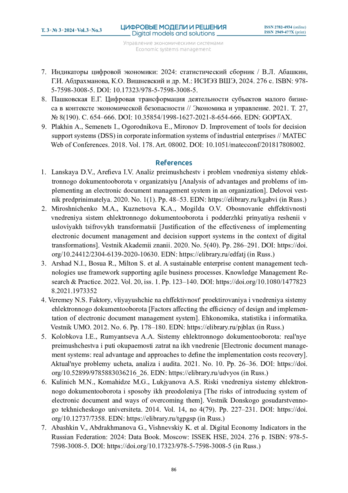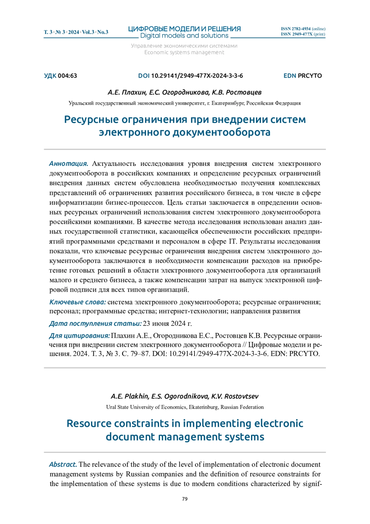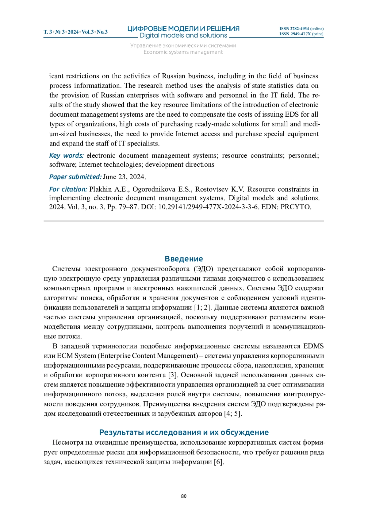 ПЛАХИН А. Е., ОГОРОДНИКОВА Е. С., РОСТОВЦЕВ К. В. РЕСУРСНЫЕ ОГРАНИЧЕНИЯ ПРИ ВНЕДРЕНИИ СИСТЕМ ЭЛЕКТРОННОГО ДОКУМЕНТООБОРОТА // ЦИФРОВЫЕ МОДЕЛИ И РЕШЕНИЯ. 2024. Т. 3 № 3