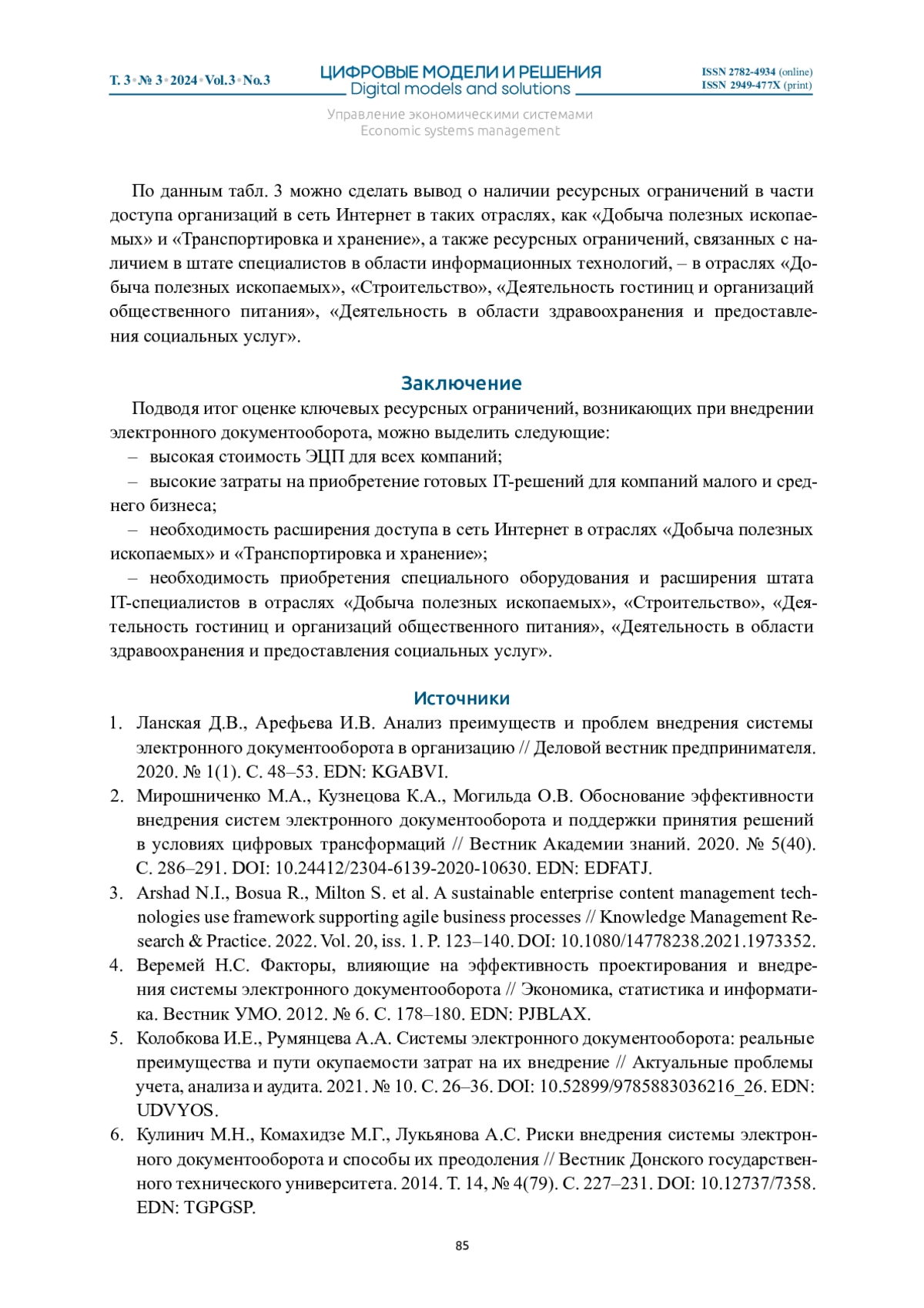 Статья: РЕСУРСНЫЕ ОГРАНИЧЕНИЯ ПРИ ВНЕДРЕНИИ СИСТЕМ ЭЛЕКТРОННОГО ДОКУМЕНТООБОРОТА (2024)