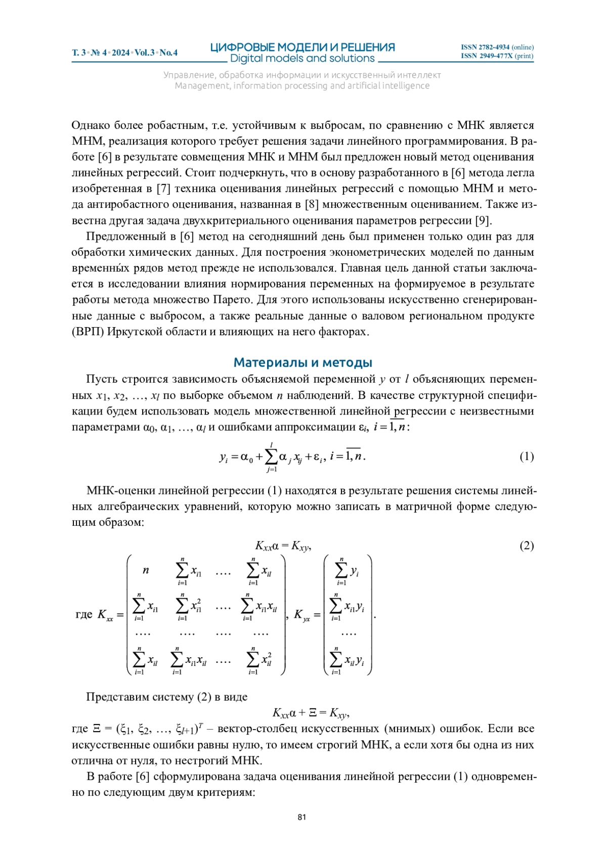 Статья: ИССЛЕДОВАНИЕ МЕТОДА ДВУХКРИТЕРИАЛЬНОГО ОЦЕНИВАНИЯ ЛИНЕЙНЫХ РЕГРЕССИОННЫХ МОДЕЛЕЙ (2024)