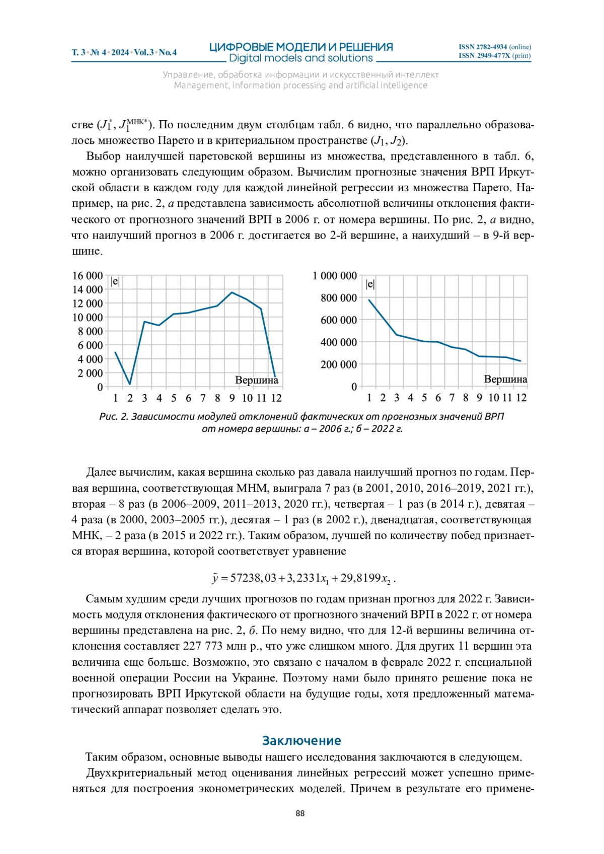 БАЗИЛЕВСКИЙ М. П. ИССЛЕДОВАНИЕ МЕТОДА ДВУХКРИТЕРИАЛЬНОГО ОЦЕНИВАНИЯ ЛИНЕЙНЫХ РЕГРЕССИОННЫХ МОДЕЛЕЙ // ЦИФРОВЫЕ МОДЕЛИ И РЕШЕНИЯ. 2024. Т. 3 № 4