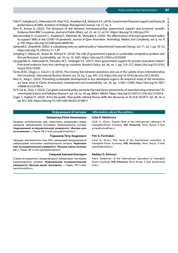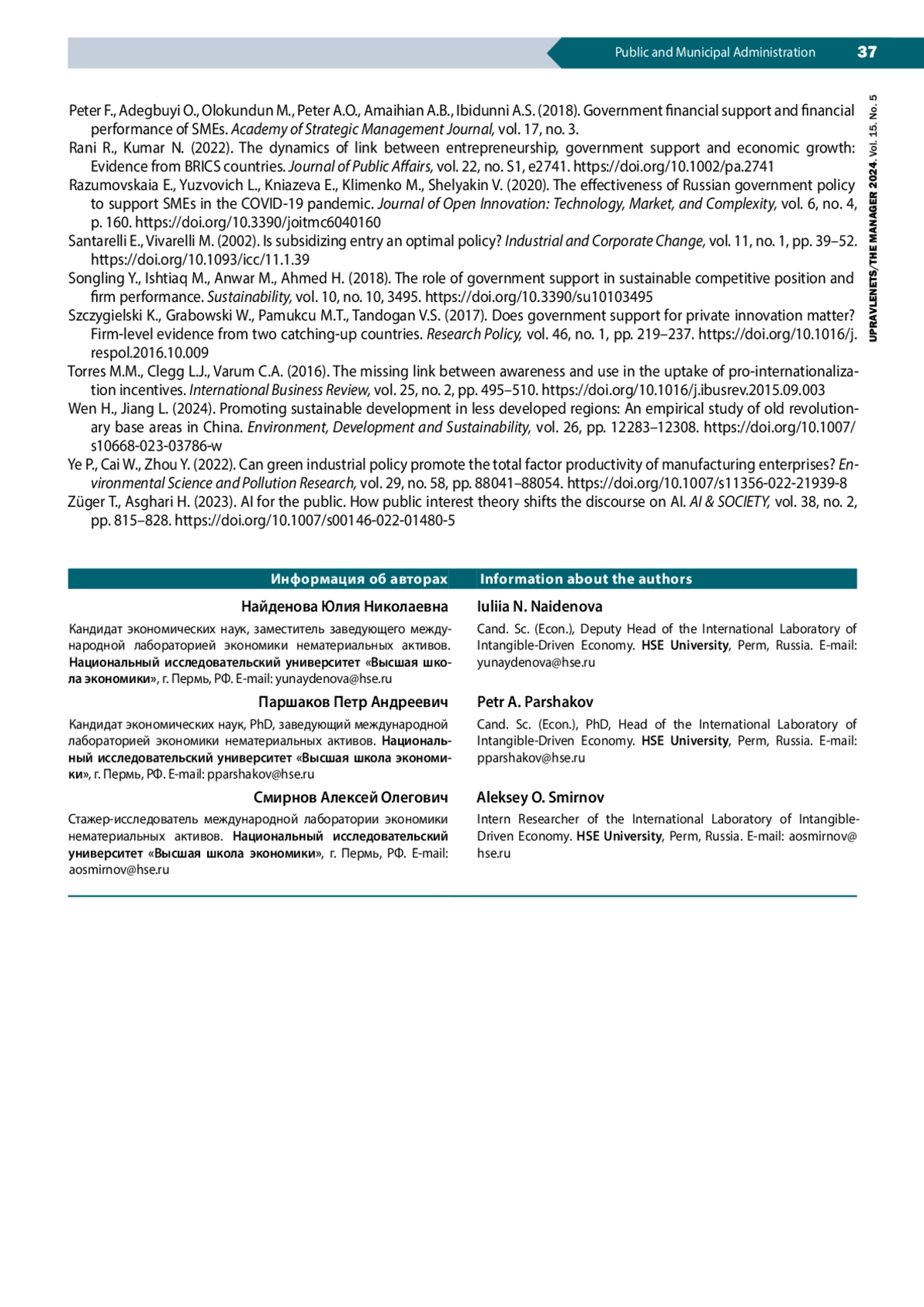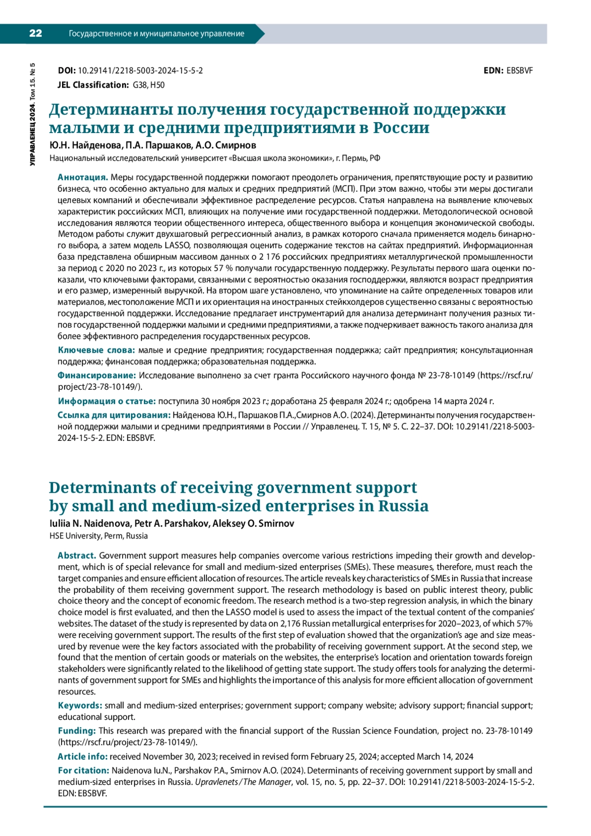 НАЙДЕНОВА Ю. Н., ПАРШАКОВ П. А., СМИРНОВ А. О. ДЕТЕРМИНАНТЫ ПОЛУЧЕНИЯ ГОСУДАРСТВЕННОЙ ПОДДЕРЖКИ МАЛЫМИ И СРЕДНИМИ ПРЕДПРИЯТИЯМИ В РОССИИ // УПРАВЛЕНЕЦ. 2024. Т. 15 № 5