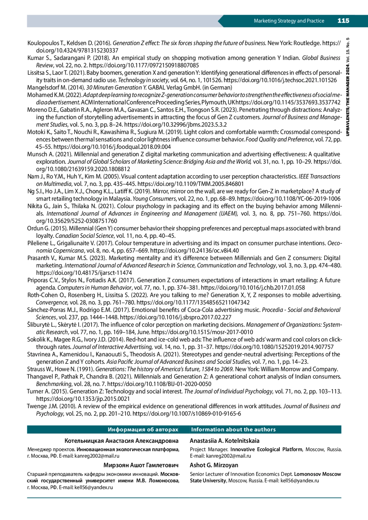 23. Munsch A. (2021). Millennial and generation Z digital marketing communication and advertising effectiveness: A qualitative exploration. Journal of Global Scholars of Marketing Science: Bridging Asia and the World, vol. 31, no. 1, pp. 10-29. DOI: 10.1080/21639159.2020.1808812 EDN: SQYPZX