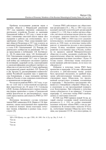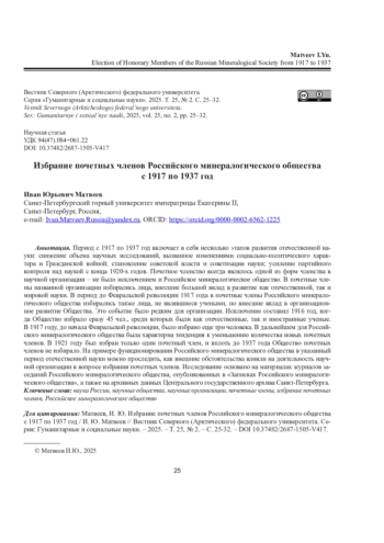 Период с 1917 по 1937 год включает в себя несколько этапов развития отечественной науки: снижение объема научных исследований, вызванное изменениями социально-политического характера и Гражданской войной; становление советской власти и советизация науки; усиление партийного контроля над наукой с конца 1920-х годов. Почетное членство всегда являлось одной из форм членства в научной организации - не было исключением и Российское минералогическое общество. В почетные члены названной организации избирались лица, внесшие большой вклад в развитие как отечественной, так и мировой науки. В период до Февральской революции 1917 года в почетные члены Российского минералогического общества избирались также лица, не являвшиеся учеными, но внесшие вклад в организационное развитие Общества. Это событие было редким для организации. Исключение составил 1916 год, когда Общество избрало сразу 45 чел., среди которых были как отечественные, так и иностранные ученые. В 1917 году, до начала Февральской революции, было избрано еще три человека. В дальнейшем для Российского минералогического общества была характерна тенденция к уменьшению количества новых почетных членов. В 1921 году был избран только один почетный член, и вплоть до 1937 года Общество почетных членов не избирало. На примере функционирования Российского минералогического общества в указанный период отечественной науки можно проследить, как внешние обстоятельства влияли на деятельность научной организации в вопросе избрания почетных членов. Исследование основано на материалах журналов заседаний Российского минералогического общества, опубликованных в «Записках Российского минералогического общества», а также на архивных данных Центрального государственного архива Санкт-Петербурга.