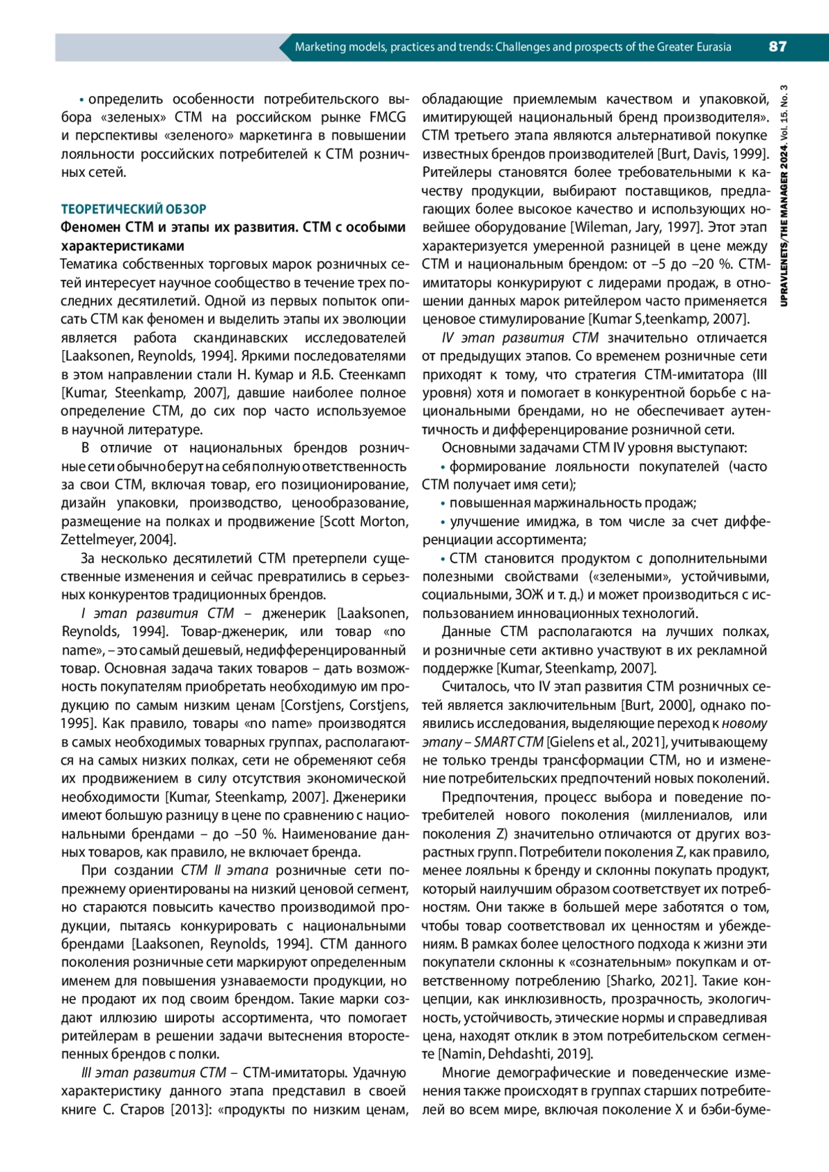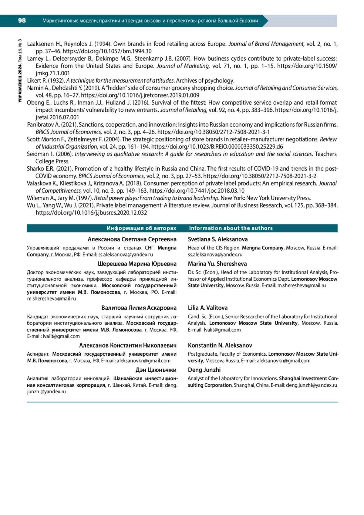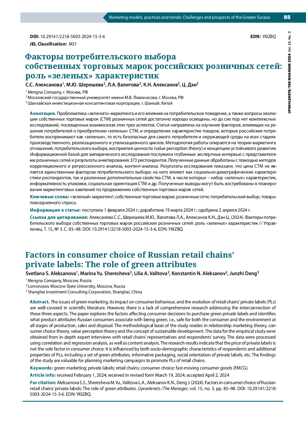 АЛЕКСАНОВА С. С., ШЕРЕШЕВА М. Ю., ВАЛИТОВА Л. А., АЛЕКСАНОВ К. Н., ДЭН Ц. ФАКТОРЫ ПОТРЕБИТЕЛЬСКОГО ВЫБОРА СОБСТВЕННЫХ ТОРГОВЫХ МАРОК РОССИЙСКИХ РОЗНИЧНЫХ СЕТЕЙ: РОЛЬ "ЗЕЛЕНЫХ" ХАРАКТЕРИСТИК // УПРАВЛЕНЕЦ. 2024. Т. 15 № 3