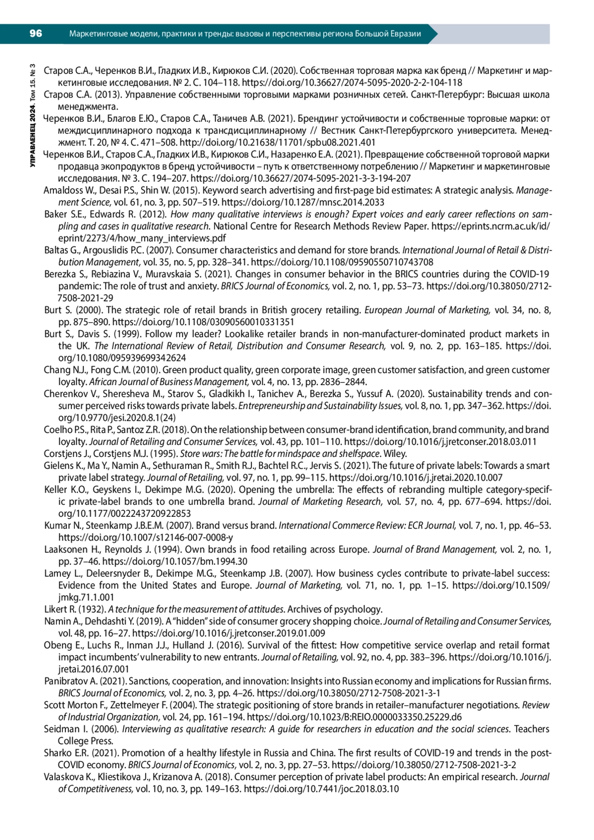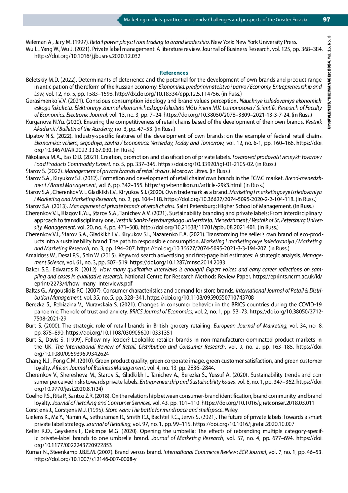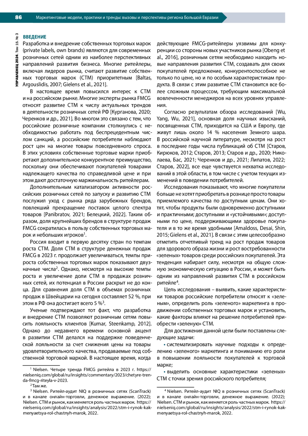 АЛЕКСАНОВА С. С., ШЕРЕШЕВА М. Ю., ВАЛИТОВА Л. А., АЛЕКСАНОВ К. Н., ДЭН Ц. ФАКТОРЫ ПОТРЕБИТЕЛЬСКОГО ВЫБОРА СОБСТВЕННЫХ ТОРГОВЫХ МАРОК РОССИЙСКИХ РОЗНИЧНЫХ СЕТЕЙ: РОЛЬ "ЗЕЛЕНЫХ" ХАРАКТЕРИСТИК // УПРАВЛЕНЕЦ. 2024. Т. 15 № 3