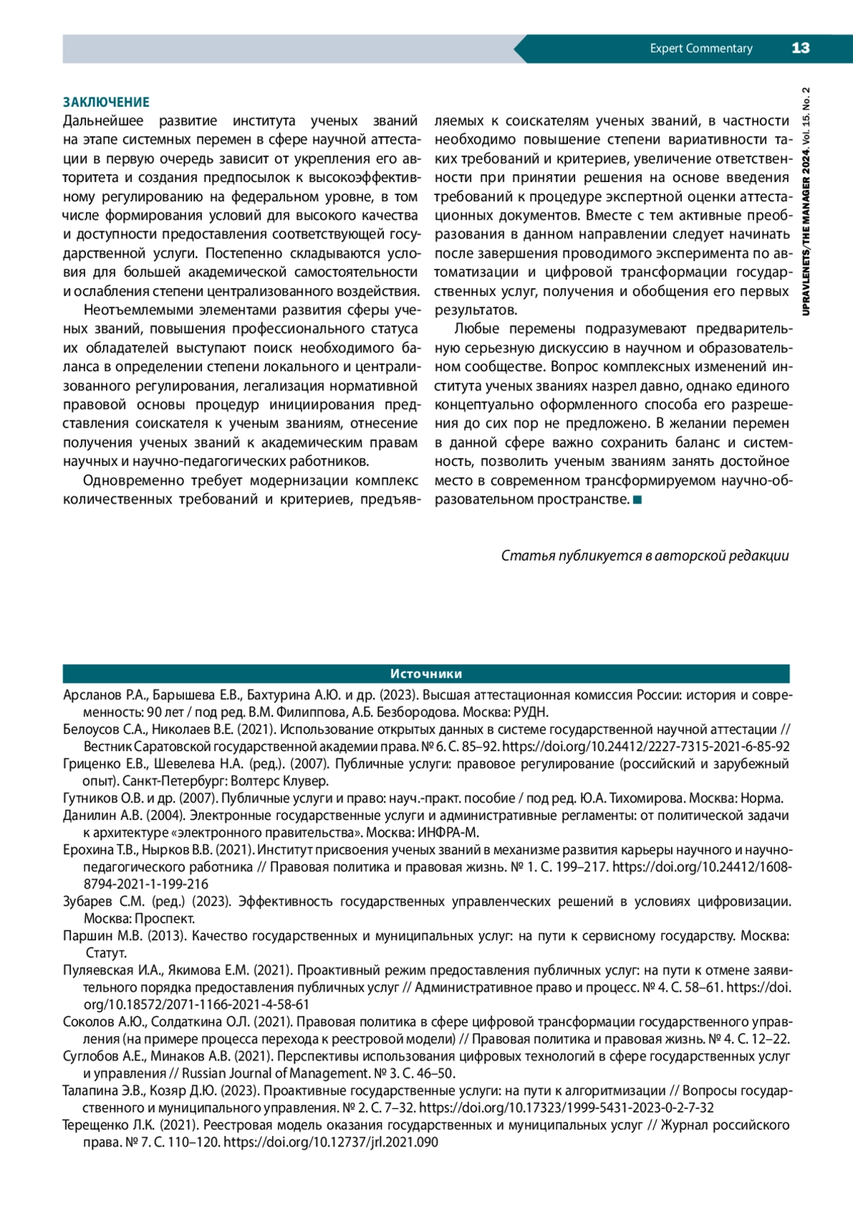 12. Талапина Э.В., Козяр Д.Ю. (2023). Проактивные государственные услуги: на пути к алгоритмизации // Вопросы государственного и муниципального управления. № 2. С. 7-32. DOI: 10.17323/1999-5431-2023-0-2-7-32 EDN: WHLQUP