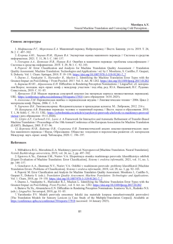 1. Мифтахова Р.Г., Морозкина Е.А. Машинный перевод. Нейроперевод // Вестн. Башкир. ун-та. 2019. Т. 24, No 2. С. 497-502.