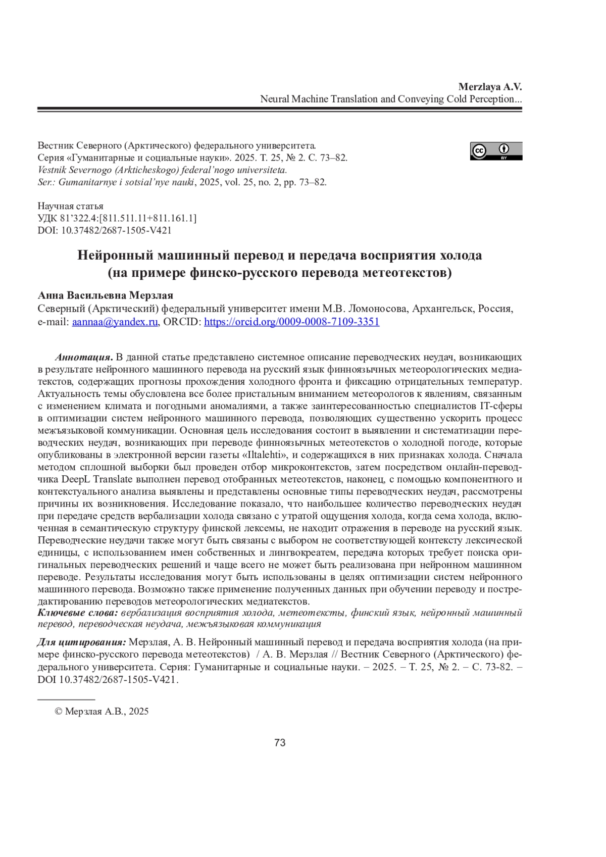 В данной статье представлено системное описание переводческих неудач, возникающих в результате нейронного машинного перевода на русский язык финноязычных метеорологических медиатекстов, содержащих прогнозы прохождения холодного фронта и фиксацию отрицательных температур. Актуальность темы обусловлена все более пристальным вниманием метеорологов к явлениям, связанным с изменением климата и погодными аномалиями, а также заинтересованностью специалистов IT-сферы в оптимизации систем нейронного машинного перевода, позволяющих существенно ускорить процесс межъязыковой коммуникации. Основная цель исследования состоит в выявлении и систематизации переводческих неудач, возникающих при переводе финноязычных метеотекстов о холодной погоде, которые опубликованы в электронной версии газеты «Iltalehti», и содержащихся в них признаках холода. Сначала методом сплошной выборки был проведен отбор микроконтекстов, затем посредством онлайн-переводчика DeepL Translate выполнен перевод отобранных метеотекстов, наконец, с помощью компонентного и контекстуального анализа выявлены и представлены основные типы переводческих неудач, рассмотрены причины их возникновения. Исследование показало, что наибольшее количество переводческих неудач при передаче средств вербализации холода связано с утратой ощущения холода, когда сема холода, включенная в семантическую структуру финской лексемы, не находит отражения в переводе на русский язык. Переводческие неудачи также могут быть связаны с выбором не соответствующей контексту лексической единицы, с использованием имен собственных и лингвокреатем, передача которых требует поиска оригинальных переводческих решений и чаще всего не может быть реализована при нейронном машинном переводе. Результаты исследования могут быть использованы в целях оптимизации систем нейронного машинного перевода. Возможно также применение полученных данных при обучении переводу и постредактированию переводов метеорологических медиатекстов.