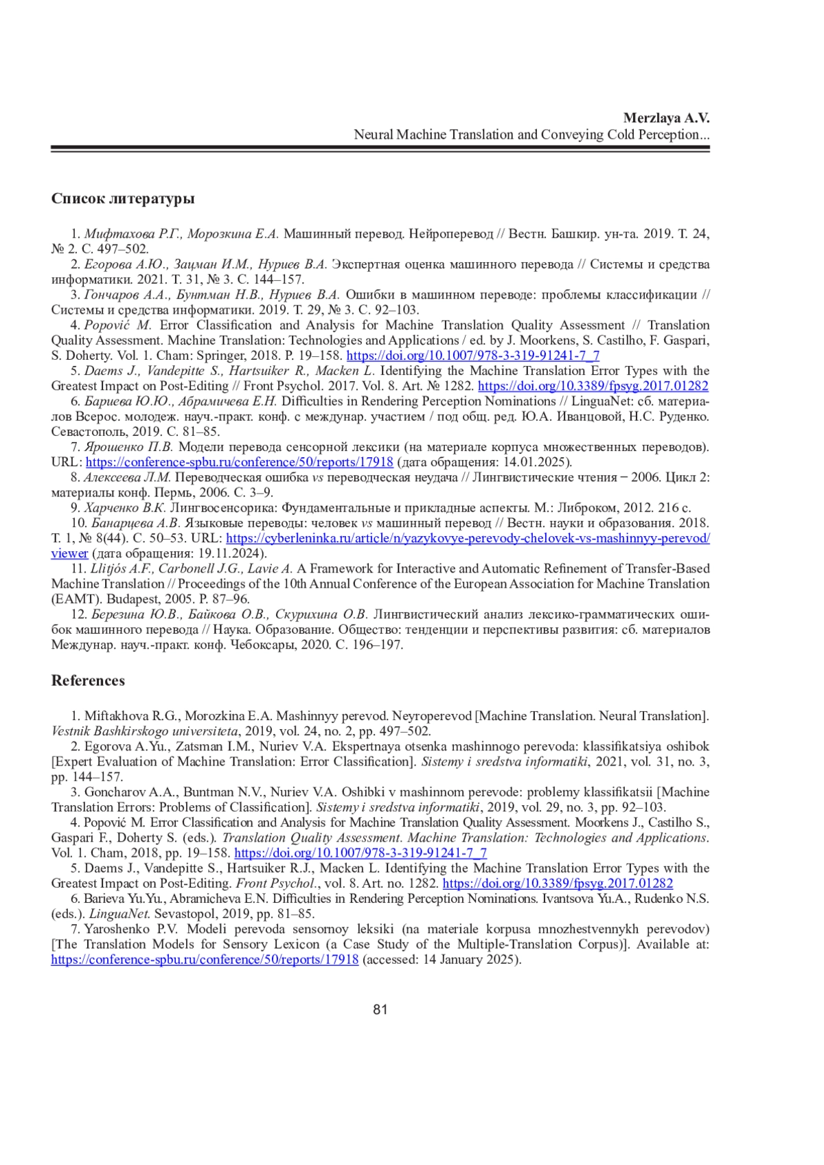 7. Ярошенко П.В. Модели перевода сенсорной лексики (на материале корпуса множественных переводов). URL: https://conference-spbu.ru/conference/50/reports/17918 (дата обращения: 14.01.2025).