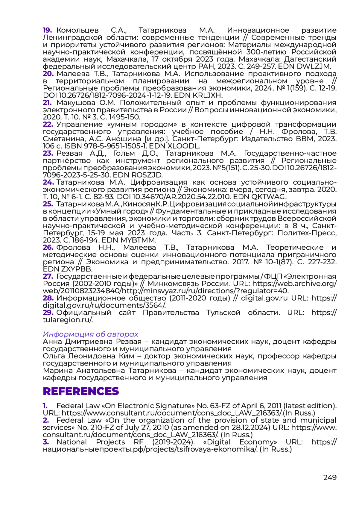 11. Васильева Е.А., Татарникова М.А. Электронное предоставление государственных и муниципальных услуг в российской федерации в условиях пандемии // Теория и практика управления государственными функциями и услугами. Тарифное регулирование: Сборник научных трудов по итогам III национальной научно-практической конференции, Санкт-Петербург, 10 ноября 2020 года / под редакцией И.В. Федосеева. Санкт-Петербург: Санкт-Петербургский государственный экономический университет, 2020. С. 53-57.