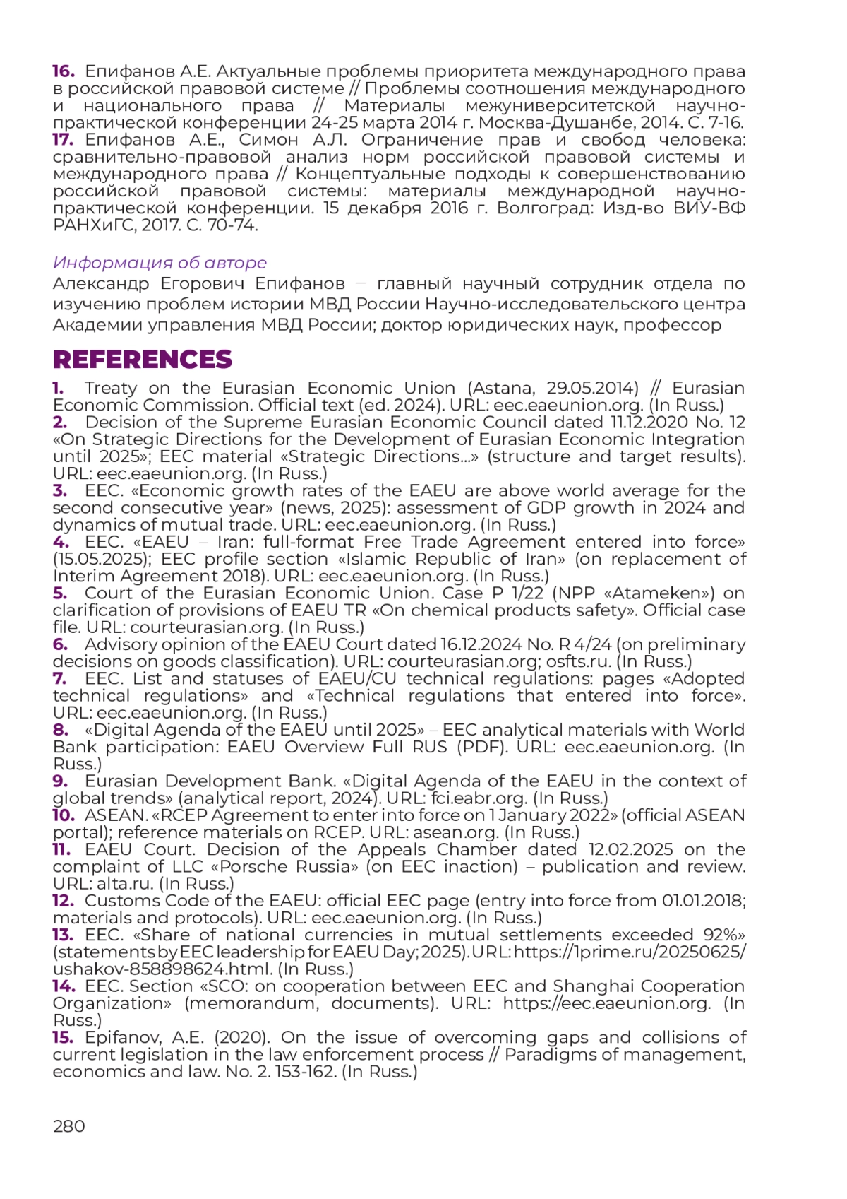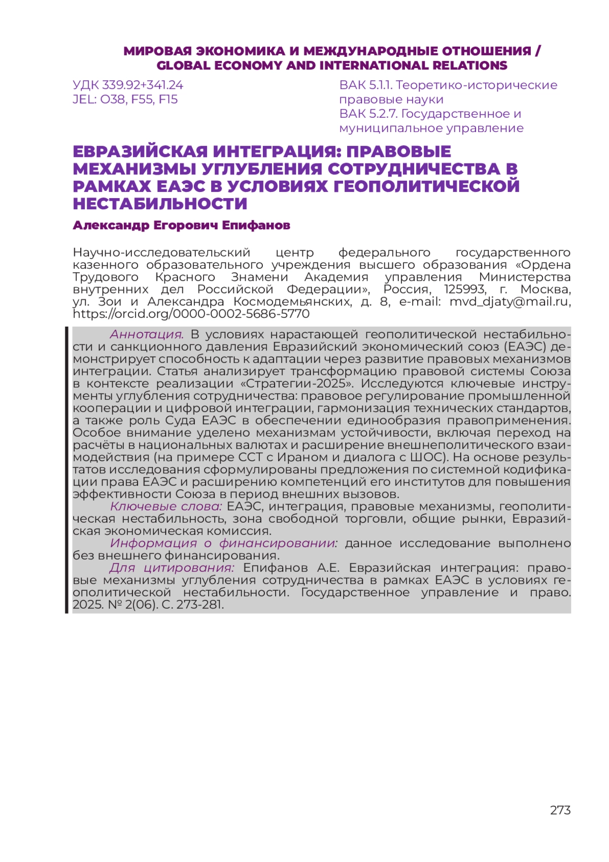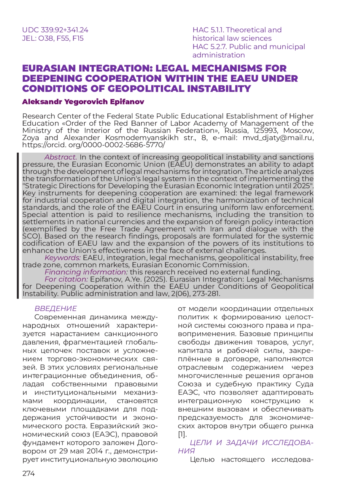 ЕПИФАНОВ А. Е. ЕВРАЗИЙСКАЯ ИНТЕГРАЦИЯ: ПРАВОВЫЕ МЕХАНИЗМЫ УГЛУБЛЕНИЯ СОТРУДНИЧЕСТВА В РАМКАХ ЕАЭС В УСЛОВИЯХ ГЕОПОЛИТИЧЕСКОЙ НЕСТАБИЛЬНОСТИ // НАУЧНЫЙ ЖУРНАЛ "ГОСУДАРСТВЕННОЕ УПРАВЛЕНИЕ И ПРАВО". 2025. № 2 (6)