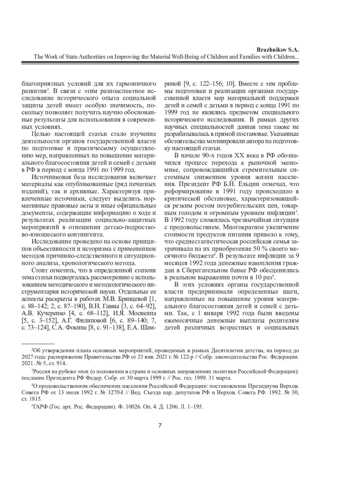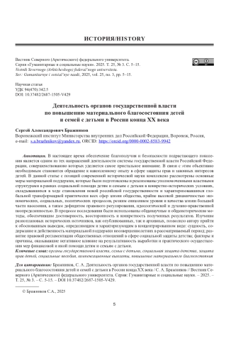 В настоящее время обеспечение благополучия и безопасности подрастающего поколения является одним из тех направлений деятельности системы государственной власти Российской Федерации, совершенствованию которых уделяется самое пристальное внимание. В связи с этим объективно необходимым становится обращение к накопленному опыту в сфере защиты прав и законных интересов детей. В данной статье с позиций современной исторической науки комплексно рассмотрены основные меры материальной поддержки, которые были подготовлены и реализованы уполномоченными властными структурами в рамках социальной помощи детям и семьям с детьми в конкретно-исторических условиях, складывавшихся в ходе становления новой российской государственности и характеризовавшихся глобальной трансформацией практически всех сфер жизни общества, крайне высокой динамичностью экономических, социальных, политических процессов, резким снижением уровня и качества жизни большей части населения, а также дефицитом правового регулирования, идеологической и духовно-нравственной неопределенностью. В процессе исследования были использованы общенаучные и общеисторические методы, обеспечившие достоверность, всесторонность и конкретность полученных результатов. Изучение разноплановых исторических источников, как опубликованных, так и архивных, позволило автору прийти к обоснованным выводам, определяющим и характеризующим в концентрированном виде: сущность, содержание и действенность материальной поддержки несовершеннолетних в рассматриваемый период; развитие правовой регламентации общественных отношений в сфере социальной защиты детства; факторы и причины, оказывавшие негативное влияние на результативность выработки и практического осуществления мер финансовой и иной помощи детям и семьям с детьми.