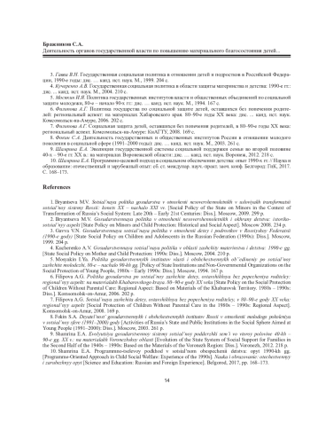 7. Филипова А.Г. Социальная защита детей, оставшихся без попечения родителей, в 80-90-е годы XX века: региональный аспект. Комсомольск-на-Амуре: КнАГТУ, 2008. 169 с. EDN: XDRKBZ
