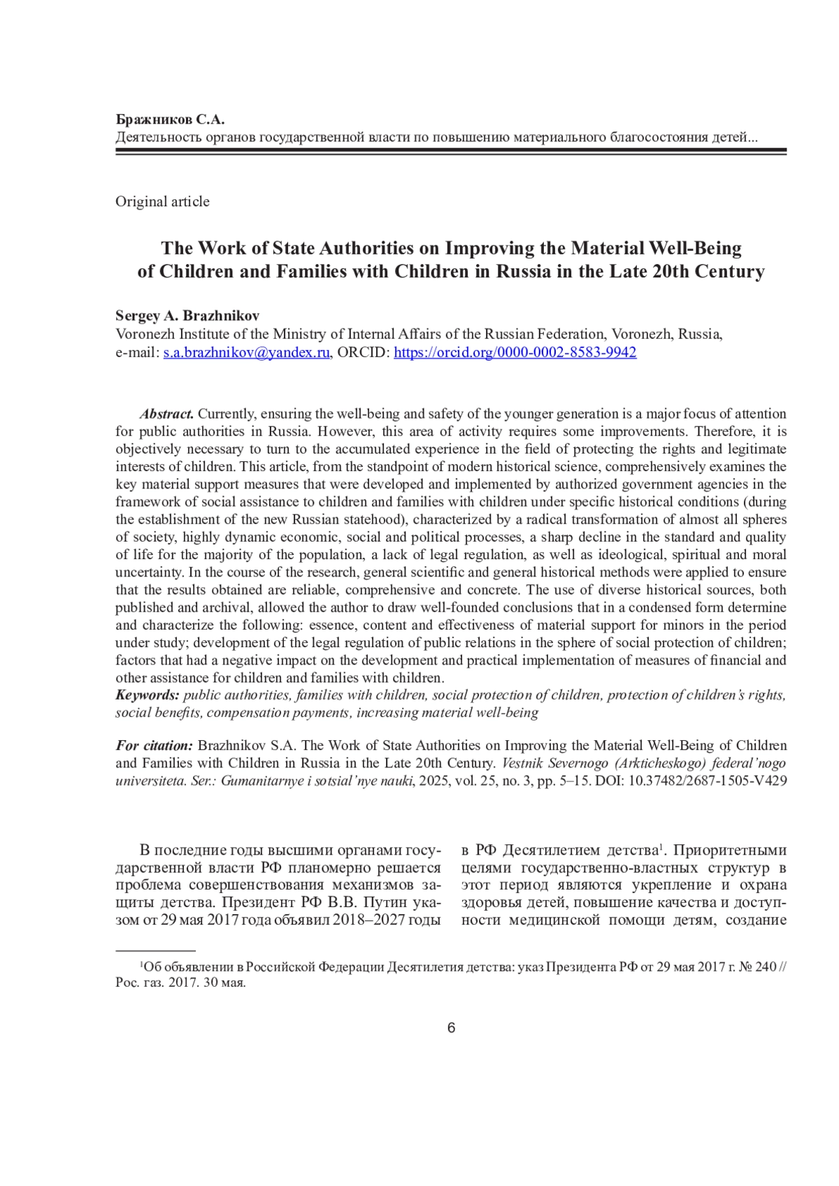 В последние годы высшими органами государственной власти РФ планомерно решается проблема совершенствования механизмов защиты детства. Президент РФ В. В. Путин указом от 29 мая 2017 года объявил 2018–2027 годы в РФ Десятилетием детства.