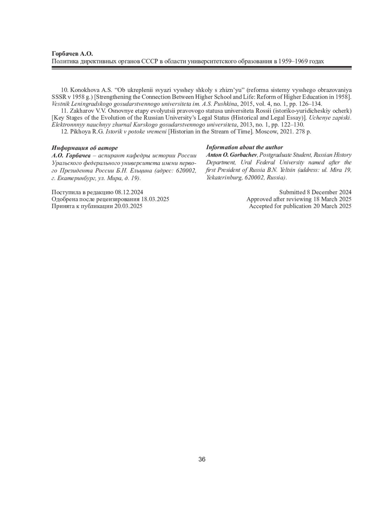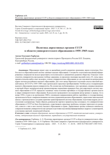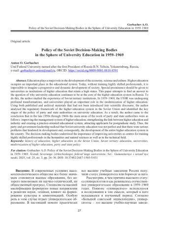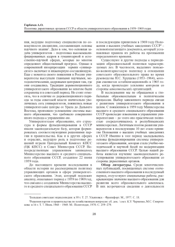 10. Конохова А.С. “Об укреплении связи высшей школы с жизнью” (реформа системы высшего образования СССР в 1958 г.) // Вестн. Ленингр. гос. ун-та им. А.С. Пушкина. 2015. Т. 4, № 1. С. 126-134. EDN: TXHTXD