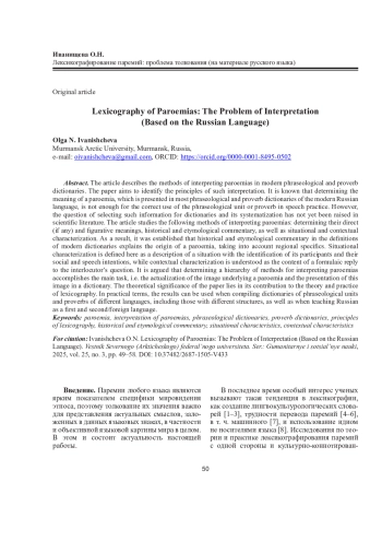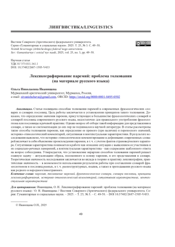 Статья посвящена способам толкования паремий в современных фразеологических словарях и словарях пословиц. Цель работы заключается в установлении принципов такого толкования. Доказано, что определение значения паремии, присутствующее в большинстве фразеологических словарей и словарей пословиц современного русского языка, недостаточно для правильного употребления фразеологизма или пословицы в речевой практике. Однако вопрос об отборе такой информации для представления в словаре, а также ее систематизации до сих пор не поднимался в научной литературе. В статье рассмотрены такие способы толкования паремии, как определение ее прямого (при наличии) и переносного значений, историко-этимологический комментарий, ситуативная и контекстуальная характеристики. В результате исследования выяснено, что историко-этимологическое комментирование в дефинициях современных словарей включает в себя объяснение происхождения паремии, в т. ч. с учетом фактов страноведческого характера. Ситуативная характеристика понимается в работе как описание ситуации с выявлением ее участников и их социально-речевых намерений, а контекстуальная характеристика - как содержание шаблонного ответа на вопрос собеседника. Утверждается, что установление иерархии способов толкования паремий решает главную задачу - актуализацию образа, положенного в основу паремии, и его представления в словаре. Теоретическая значимость исследования заключается во вкладе в теорию и практику лексикографии, практическая значимость - в возможности использования результатов работы при составлении словарей фразеологизмов и пословиц разных, в т. ч. разноструктурных, языков, а также в преподавании русского языка как родного и неродного/иностранного.