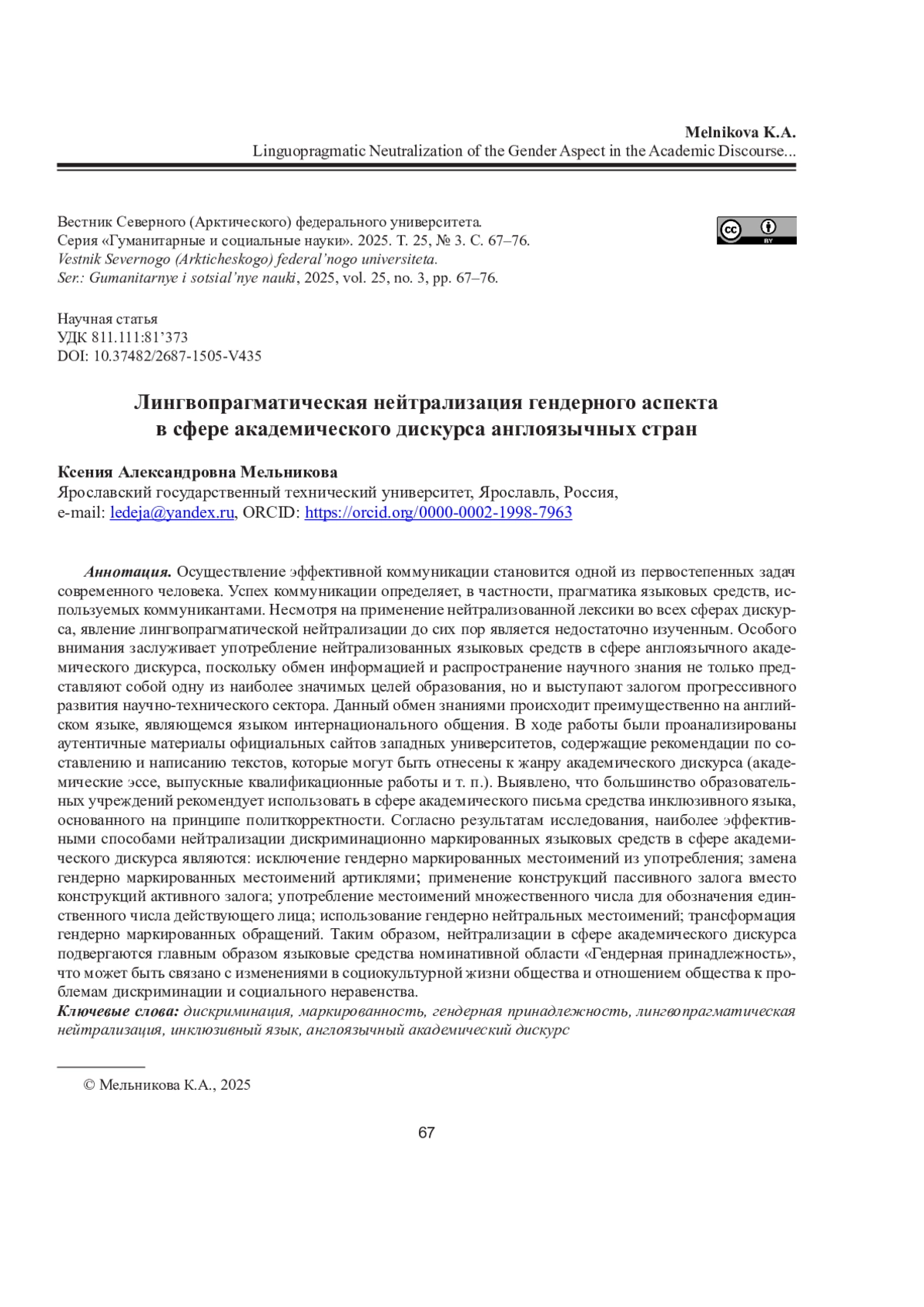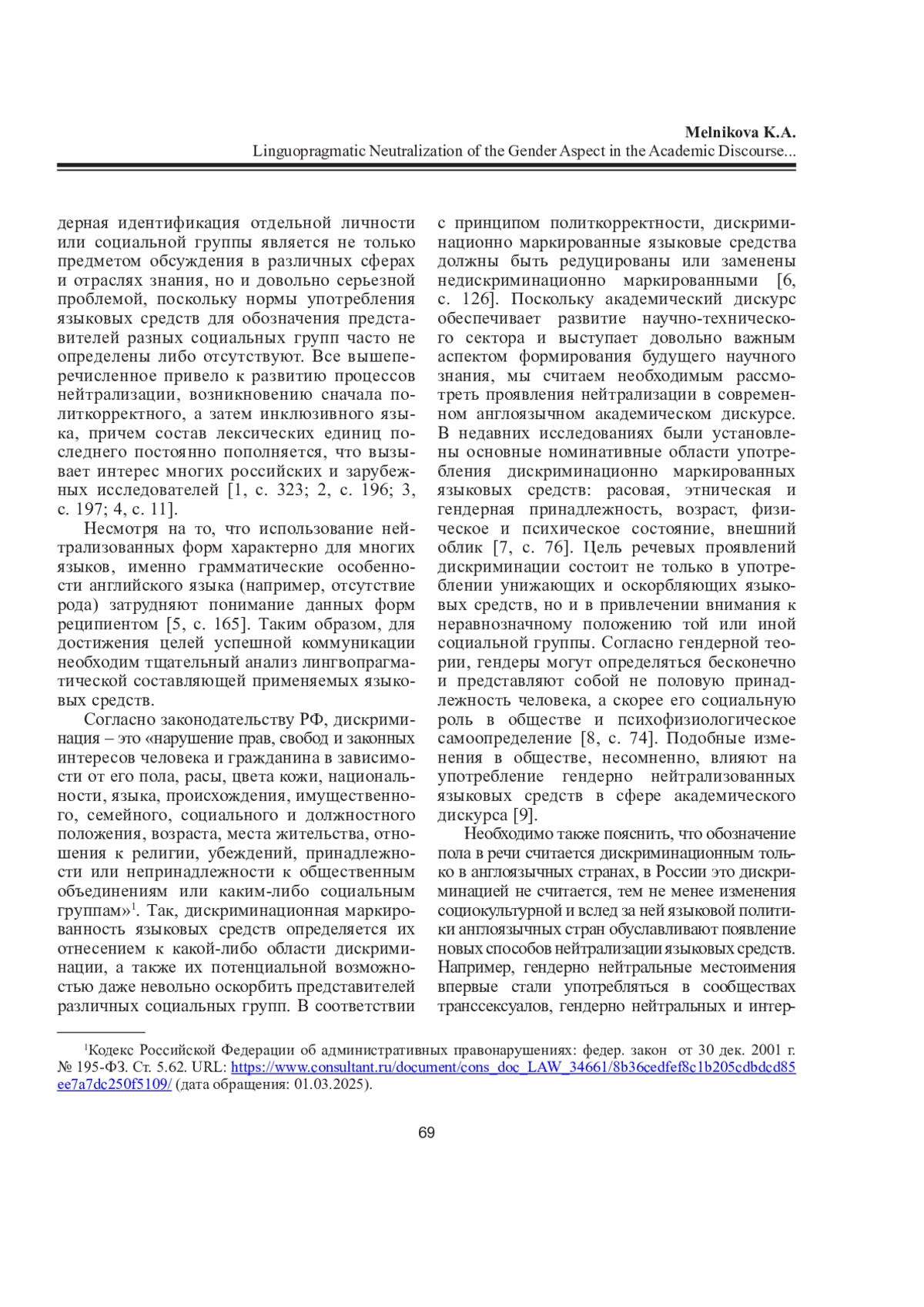 7. Мельникова К.А., Чекунова Е.М. Определение наиболее продуктивных способов нейтрализации дискриминационно маркированных лексических единиц в соответствии с принципом политкорректности в медиадискурсе // Соврем. лингвист. и метод.-дидакт. исслед. 2022. № 4(56). С. 74-84. DOI: 10.36622/VSTU.2022.16.72.006