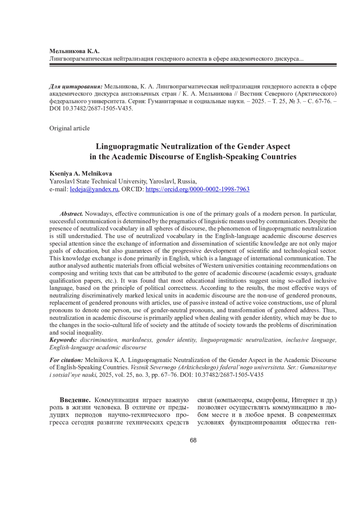 Осуществление эффективной коммуникации становится одной из первостепенных задач современного человека. Успех коммуникации определяет, в частности, прагматика языковых средств, используемых коммуникантами. Несмотря на применение нейтрализованной лексики во всех сферах дискурса, явление лингвопрагматической нейтрализации до сих пор является недостаточно изученным. Особого внимания заслуживает употребление нейтрализованных языковых средств в сфере англоязычного академического дискурса, поскольку обмен информацией и распространение научного знания не только представляют собой одну из наиболее значимых целей образования, но и выступают залогом прогрессивного развития научно-технического сектора. Данный обмен знаниями происходит преимущественно на английском языке, являющемся языком интернационального общения. В ходе работы были проанализированы аутентичные материалы официальных сайтов западных университетов, содержащие рекомендации по составлению и написанию текстов, которые могут быть отнесены к жанру академического дискурса (академические эссе, выпускные квалификационные работы и т. п.). Выявлено, что большинство образовательных учреждений рекомендует использовать в сфере академического письма средства инклюзивного языка, основанного на принципе политкорректности. Согласно результатам исследования, наиболее эффективными способами нейтрализации дискриминационно маркированных языковых средств в сфере академического дискурса являются: исключение гендерно маркированных местоимений из употребления; замена гендерно маркированных местоимений артиклями; применение конструкций пассивного залога вместо конструкций активного залога; употребление местоимений множественного числа для обозначения единственного числа действующего лица; использование гендерно нейтральных местоимений; трансформация гендерно маркированных обращений. Таким образом, нейтрализации в сфере академического дискурса подвергаются главным образом языковые средства номинативной области «Гендерная принадлежность», что может быть связано с изменениями в социокультурной жизни общества и отношением общества к проблемам дискриминации и социального неравенства.