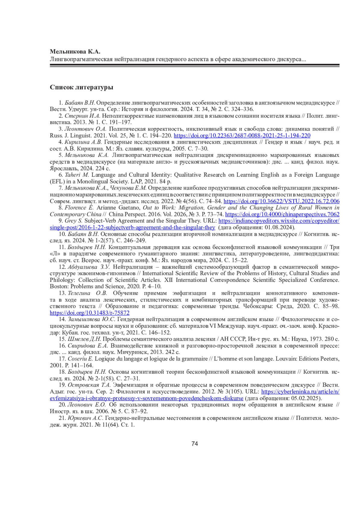 3. Леонтович О.А. Политическая корректность, инклюзивный язык и свобода слова: динамика понятий // Russ. J. Linguist. 2021. Vol. 25, № 1. C. 194-220. DOI: 10.22363/2687-0088-2021-25-1-194-220 EDN: KMJJWZ