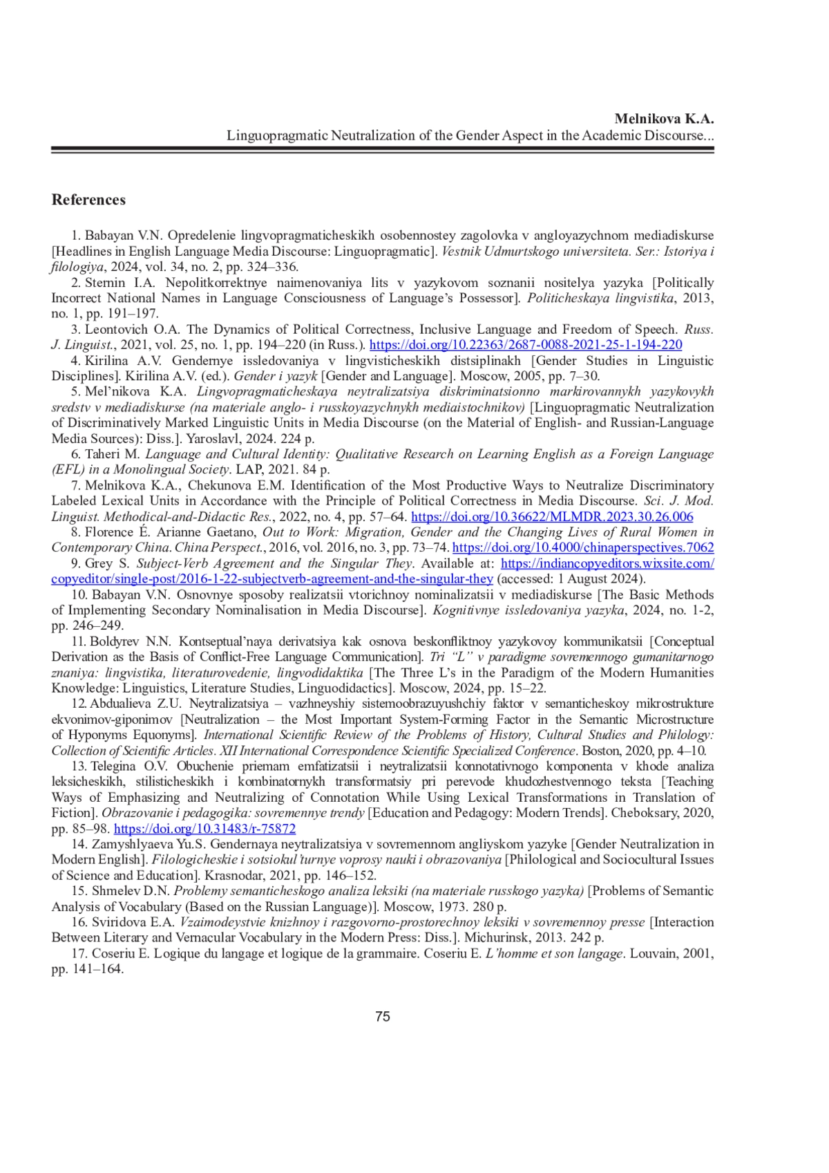 14. Замышляева Ю.С. Гендерная нейтрализация в современном английском языке // Филологические и социокультурные вопросы науки и образования: сб. материалов VI Междунар. науч.-практ. оч.-заоч. конф. Краснодар: Кубан. гос. технол. ун-т, 2021. С. 146-152. EDN: WDRXWP