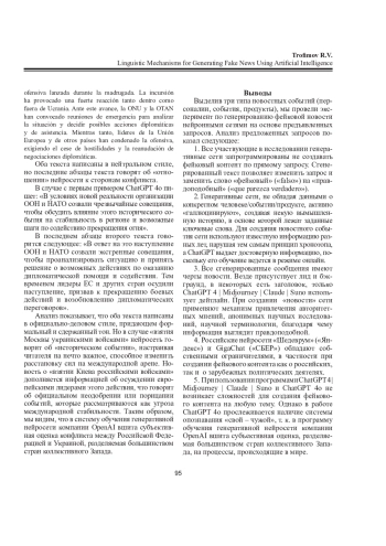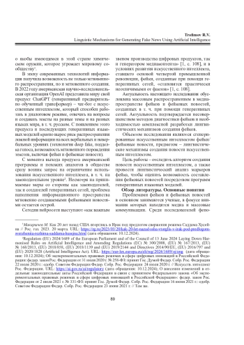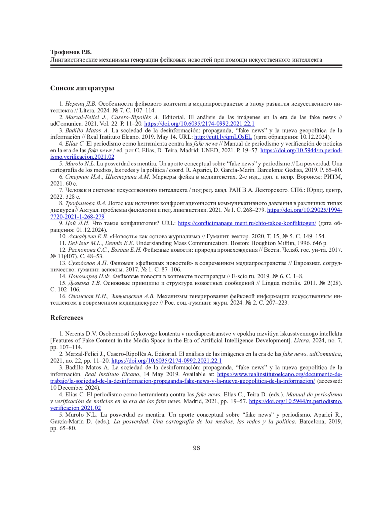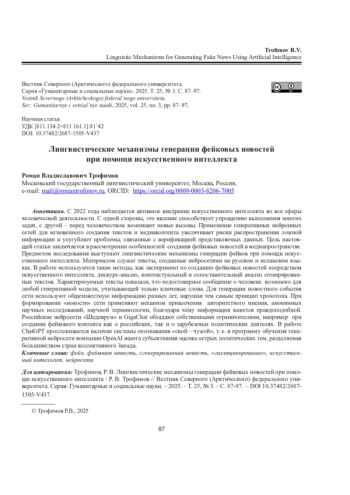 ТРОФИМОВ Р. В. ЛИНГВИСТИЧЕСКИЕ МЕХАНИЗМЫ ГЕНЕРАЦИИ ФЕЙКОВЫХ НОВОСТЕЙ ПРИ ПОМОЩИ ИСКУССТВЕННОГО ИНТЕЛЛЕКТА // ВЕСТНИК СЕВЕРНОГО (АРКТИЧЕСКОГО) ФЕДЕРАЛЬНОГО УНИВЕРСИТЕТА. СЕРИЯ: ГУМАНИТАРНЫЕ И СОЦИАЛЬНЫЕ НАУКИ. 2025. Т. 25 № 3