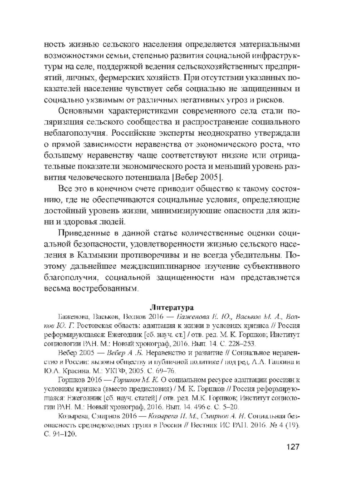 1. Баженова Е. Ю., Васьков М. А., Волков Ю. Г. Ростовская область: адаптация к жизни в условиях кризиса // Россия реформирующаяся: Ежегодник [сб. науч. ст.] / отв. ред. М. К. Горшков; Институт социологии РАН. М.: Новый хронограф, 2016. Вып. 14. С. 228-253.
