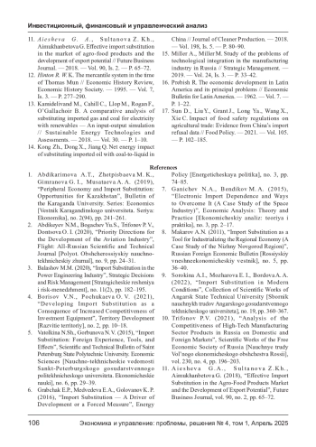1. Абдикаримова А. Т., Жетписбаева М. К., Гимранова Г. И., Мусатаева А. А. Периферийная экономика и импортозамещение: возможности для Казахстана // Вестник Карагандинского университета. Серия: Экономика. - 2019. - № 2(94). - С. 241-261. EDN: EKTSSS