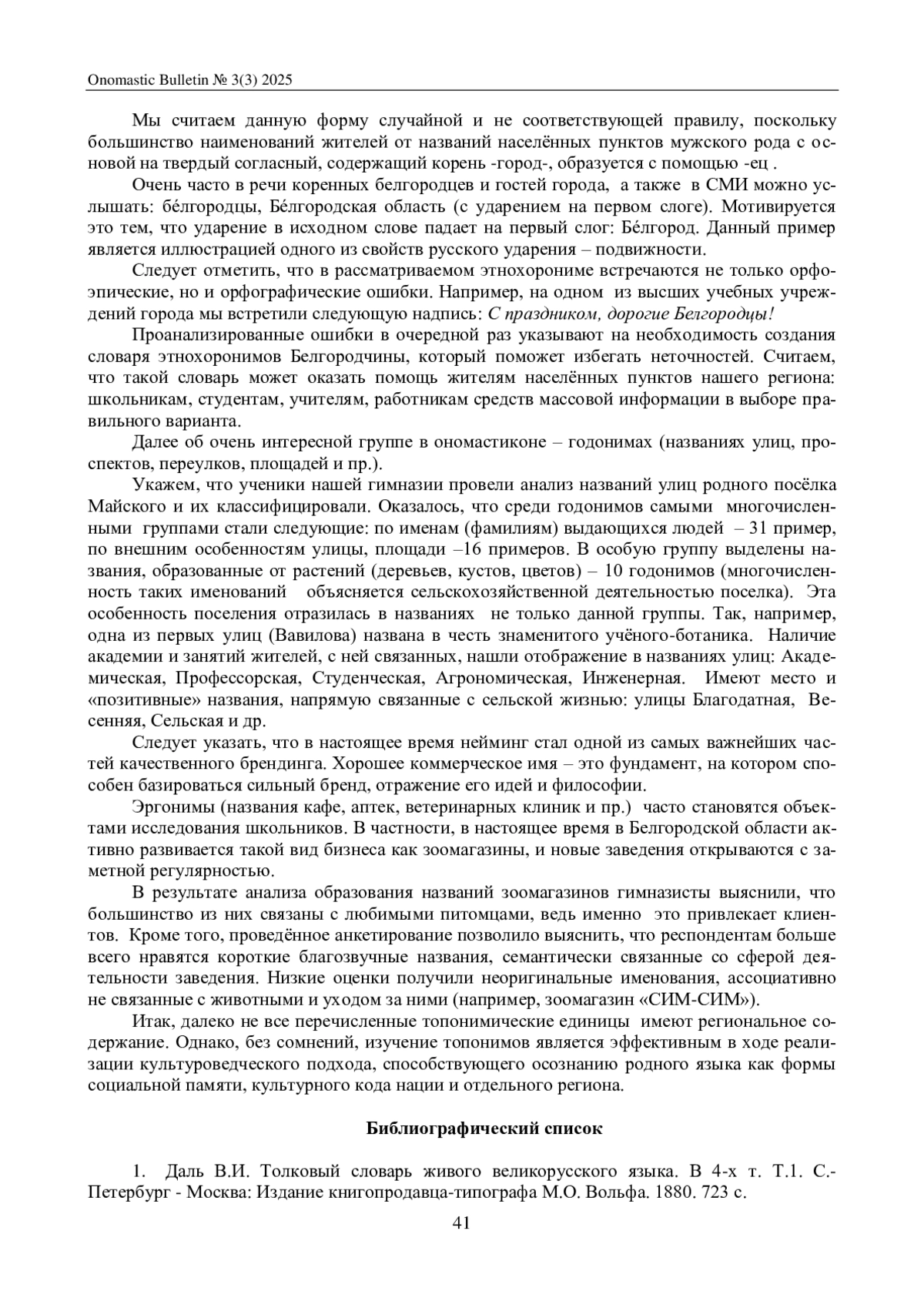 В статье исследована ценность топонимов как элемента социального и культурного пространства субъектов Российской Федерации. Сделан вывод, что значимость наименований географических объектов выходит далеко за рамки простого обозначения территориального объекта, поскольку каждое название имеет свою уникальную историю, связанную с разными аспектами жизни региона, его населением и природой. Рассмотрены функции топонимов, такие как сохранение исторической памяти, формирование региональной идентичности и поддержание межкультурных связей. Определено, что названия внутригородских районов, улиц, переулков, площадей, набережных, парков, скверов (урбанонимы) несут ценную информацию о людях, местах, важных событиях и явлениях, связанных с конкретным населенным пунктом (ул. Загоровского, ул. Платонова, ул. Тулебердиева). Показано особое значение героических топонимов. Подчеркнута роль топонимов в устном народном творчестве (топонимические тексты – легенды и предания, которые зачастую содержат значительную долю фантазии), приведены примеры местных легенд и фольклорных произведений, построенных вокруг конкретных географических названий (Илья Муромец, Муромская дорожка). Значение локальных топонимов выходит далеко за пределы простого обозначения места проживания, их использование формирует устойчивые образы и представления о регионе среди самих жителей и гостей. Акцентируется внимание на значимости исследования топонимии для понимания процессов социальной адаптации, самоидентификации и культурных взаимодействий в регионах России, в связи с чем изучение и сохранение топонимов должно стать важной задачей не только ученых-гуманитариев, но и государственных органов.