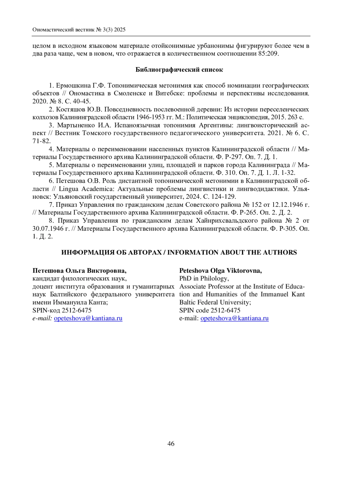 6. Петешова О.В. Роль дистантной топонимической метонимии в Калининградской области // Lingua Academica: Актуальные проблемы лингвистики и лингводидактики. Ульяновск: Ульяновский государственный университет, 2024. С. 124-129.