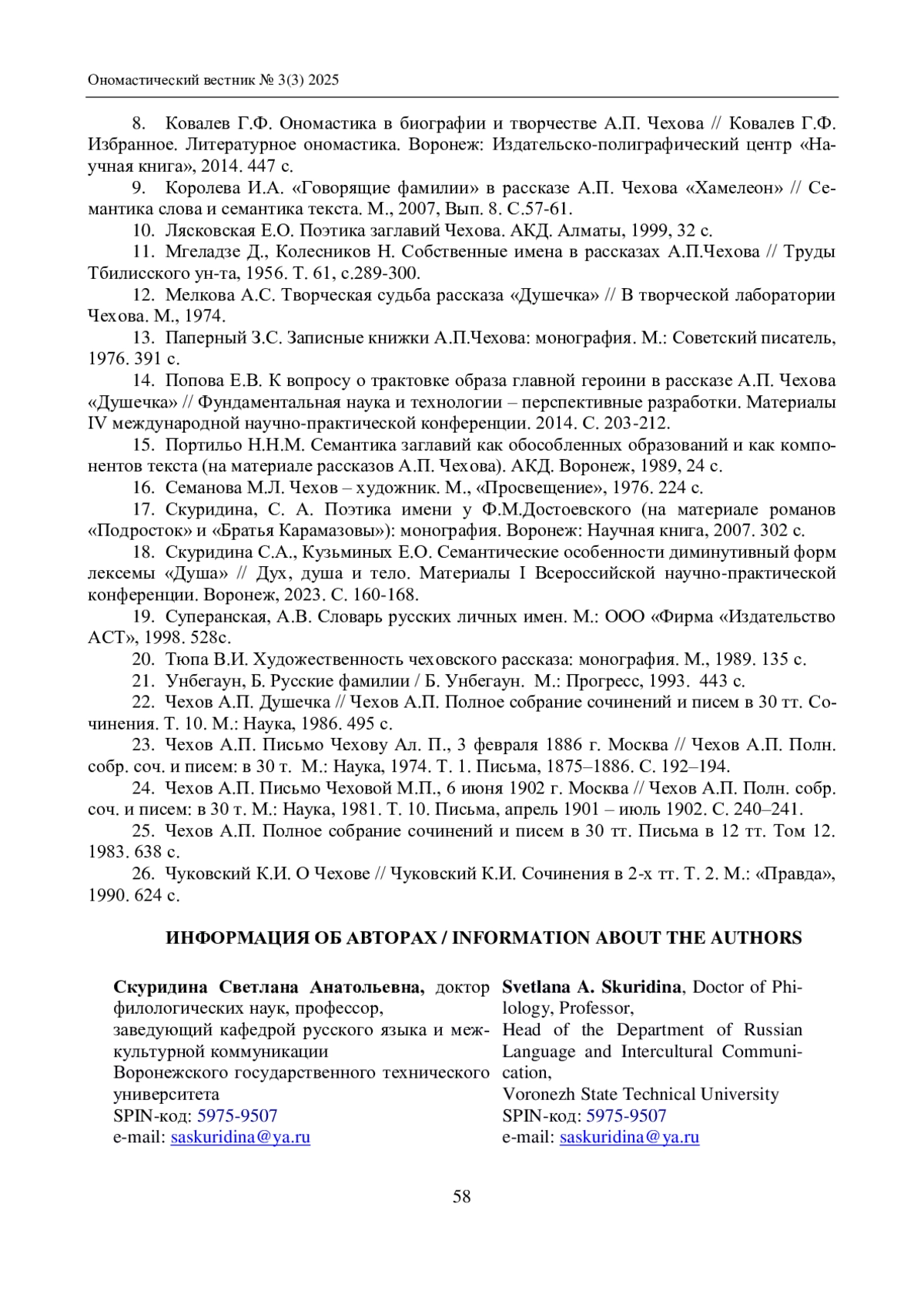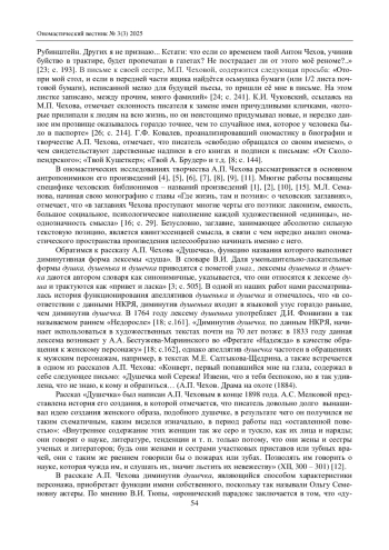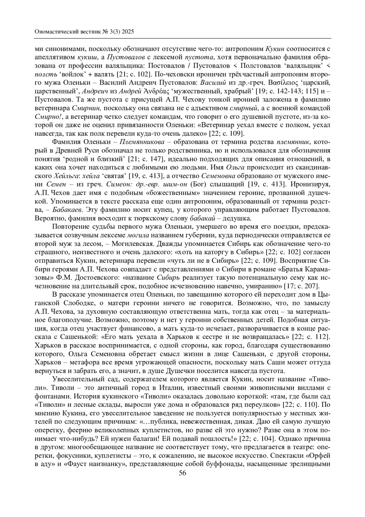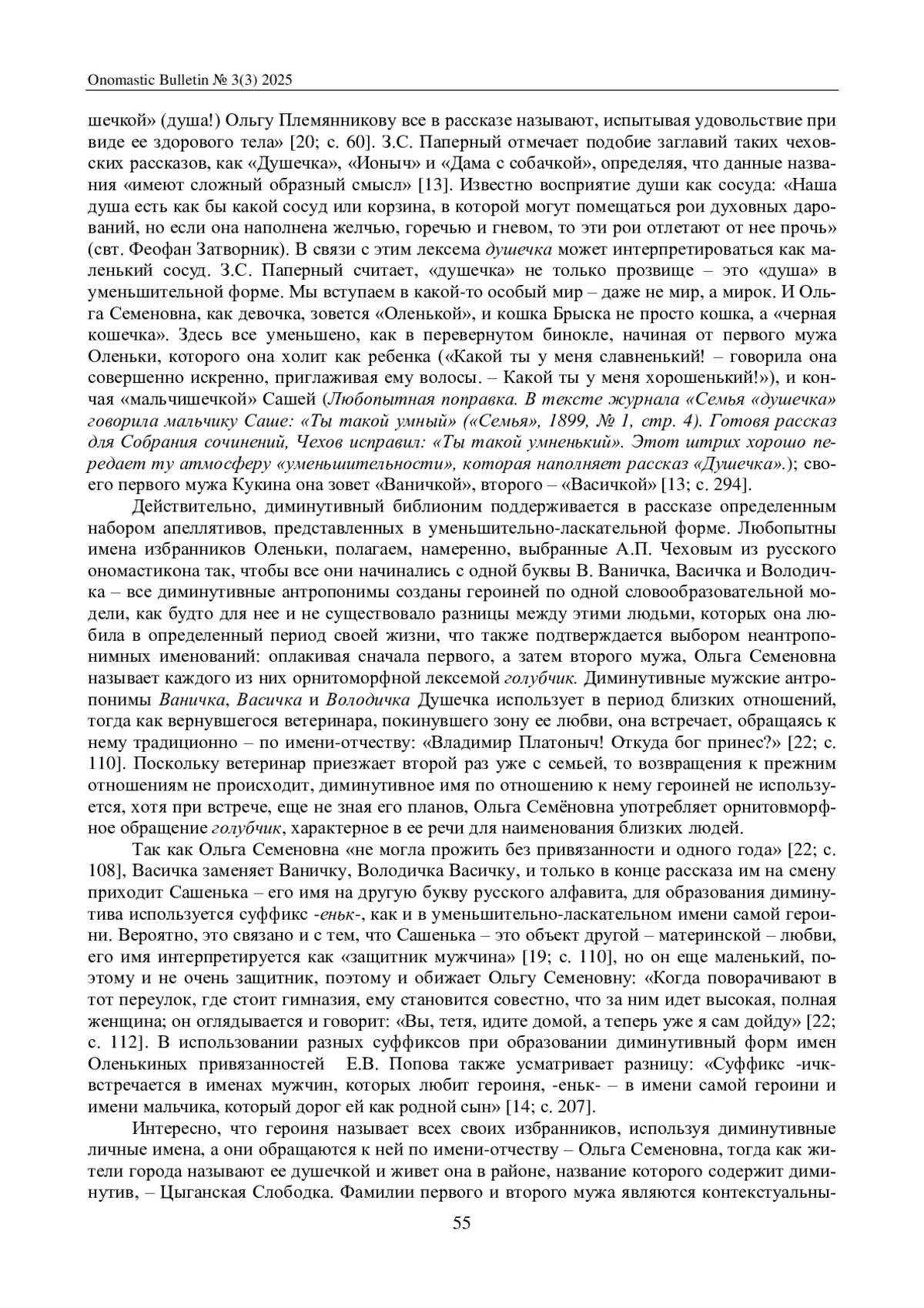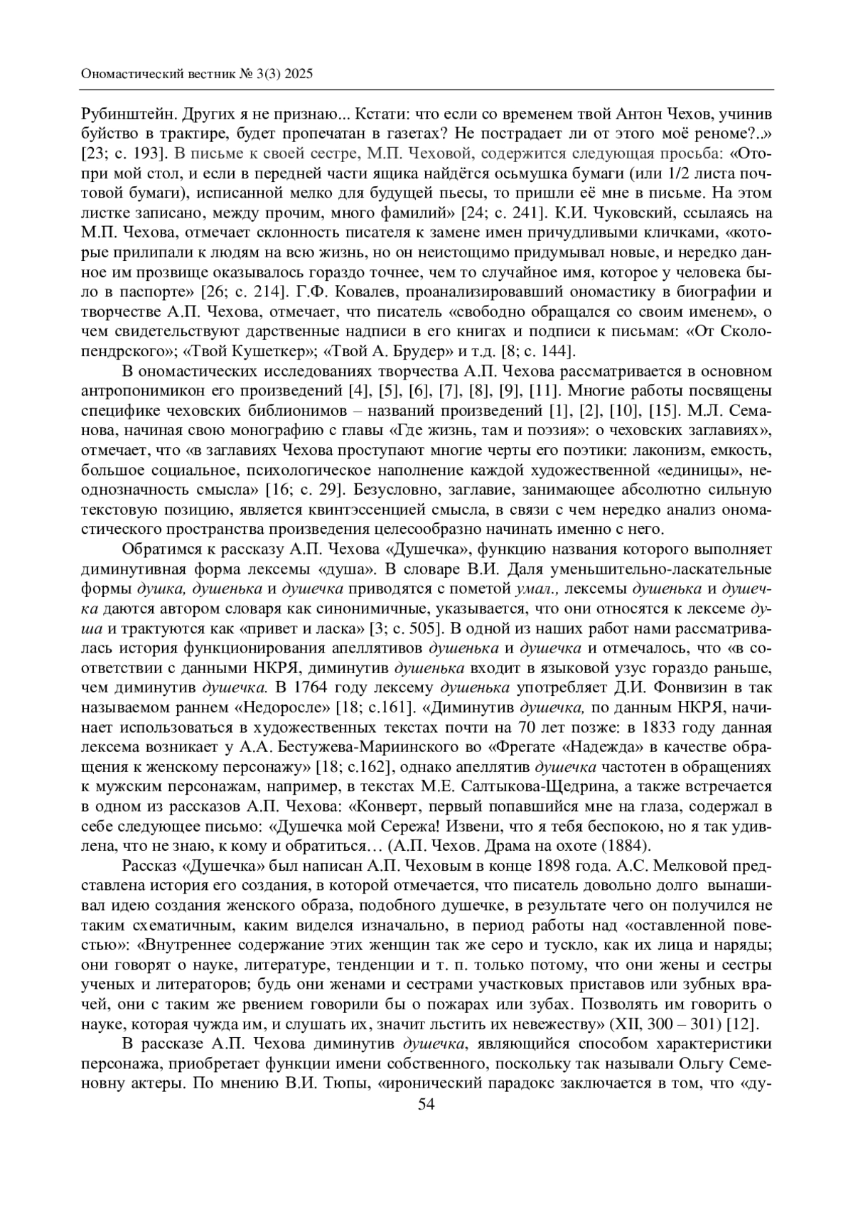 СКУРИДИНА С. А. «ДУШЕЧКА» А. П. ЧЕХОВА: ОНОМАСТИЧЕСКИЙ ПОДХОД // ОНОМАСТИЧЕСКИЙ ВЕСТНИК. 2025. № 3 (3)