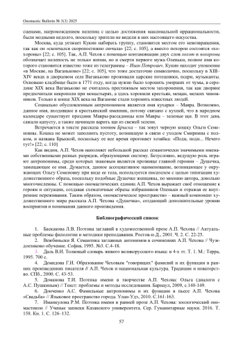 Статья посвящена исследованию ономастического пространства чеховского рассказа «Душечка», выяв-лению роли имен собственных в формировании образа главной героини – Оленьки Племянниковой – и других персонажей. Отмечается, что А. П. Чехов придавал значение именам, продумывал антропонимы и топонимы, в связи с чем они несут в тексте рассказа определенную смысловую нагрузку. Рассмотрение ономастикона начинается с анализа библионима «Душечка», который предопределяет выбор не только онимных, но и апеллятивных элементов с диминутивными суффиксами. Анализируются также топонимы и другие онимные единицы, встречающиеся в тексте, отмечается, что имена собственные способствуют созданию атмосферы провинциального городка конца XIX века и углубляют понимание психологических особенностей персонажей.
