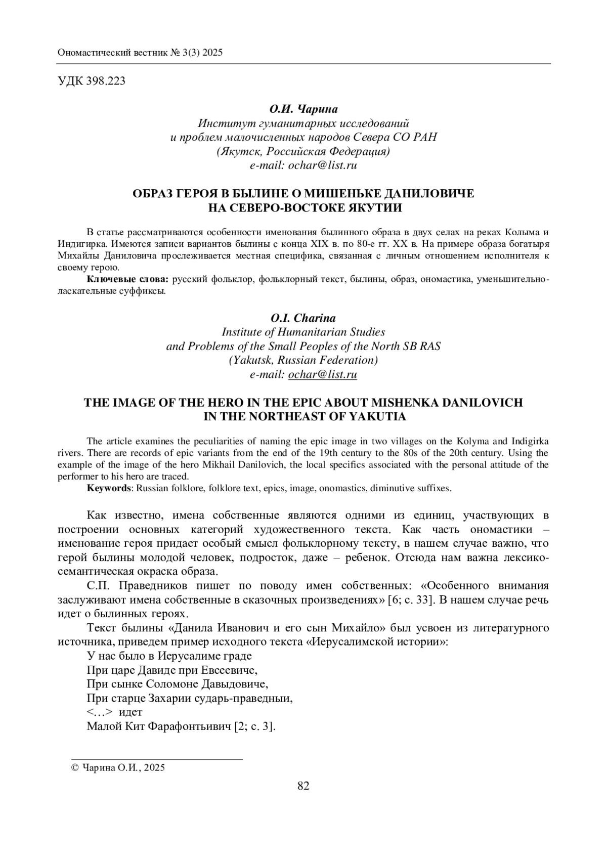 В статье рассматриваются особенности именования былинного образа в двух селах на реках Колыма и Индигирка. Имеются записи вариантов былины с конца XIX в. по 80-е гг. ХХ в. На примере образа богатыря Михайлы Даниловича прослеживается местная специфика, связанная с личным отношением исполнителя к своему герою.