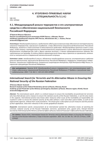 Предмет настоящего исследования определен взглядом на международный розыск лица в целях ареста и выдачи для уголовного преследования или исполнения приговора как на средство реализации неотвратимости ответственности и обеспечения национальной безопасности государства. Такой взгляд диктует необходимость преодоления сложившихся в науке стереотипов и включения в систему международного розыска всех действий, которые реально предпринимаются правоохранительными и другими специальными органами государства в целях ареста и выдачи скрывшегося лица для уголовного преследования или исполнения приговора. В юридической литературе в этой связи не без оснований отмечается, что международный розыск обвиняемых и осужденных является одним из основных инструментов российской правоохранительной системы по установлению местонахождения скрывшихся от следствия лиц и их привлечения к уголовной ответственности, обеспечения принципа неотвратимости наказания [6, с. 91].