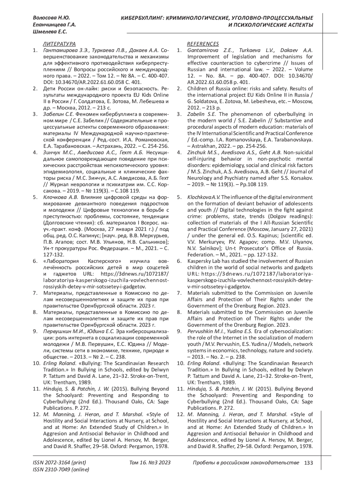 3. Забелин С.Е. Феномен кибербуллинга в современном мире / С.Е. Забелин // Содержательные и процессуальные аспекты современного образования: материалы IV Международной научно-практической конференции / Ред.-сост. И.А. Романовская, Е.А. Тарабановская. - Астрахань, 2022. - С. 254-256.