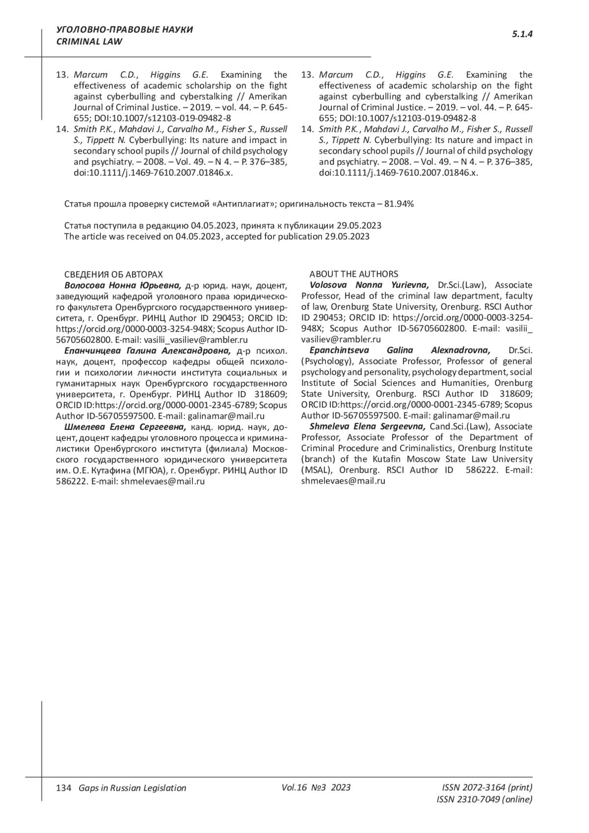 13. Marcum C.D., Higgins G.E. Examining the effectiveness of academic scholarship on the fight against cyberbulling and cyberstalking // Amerikan Journal of Criminal Justice. - 2019. - vol. 44. - P. 645-655;. DOI: 10.1007/s12103-019-09482-8